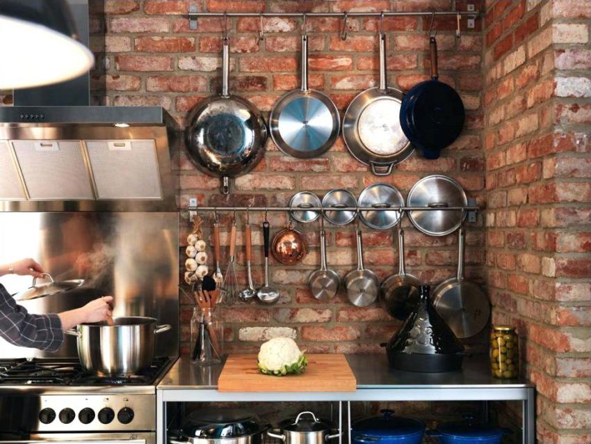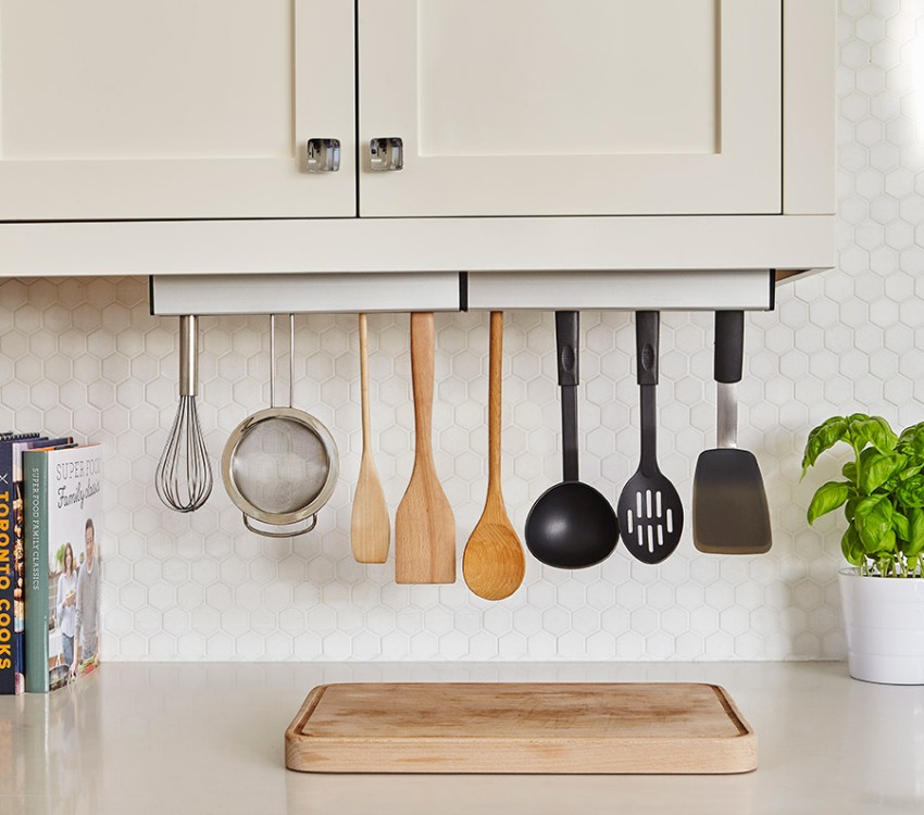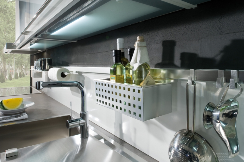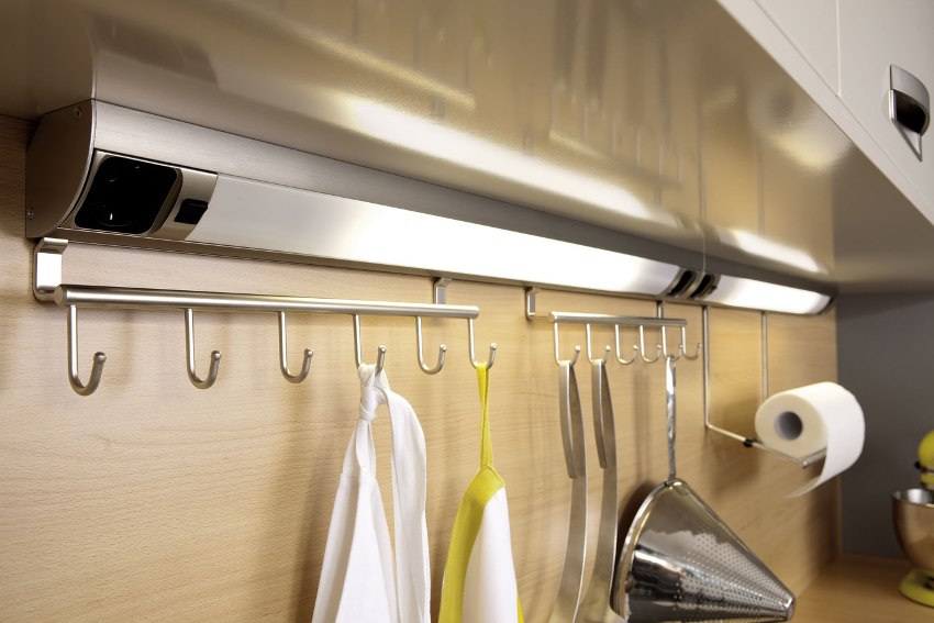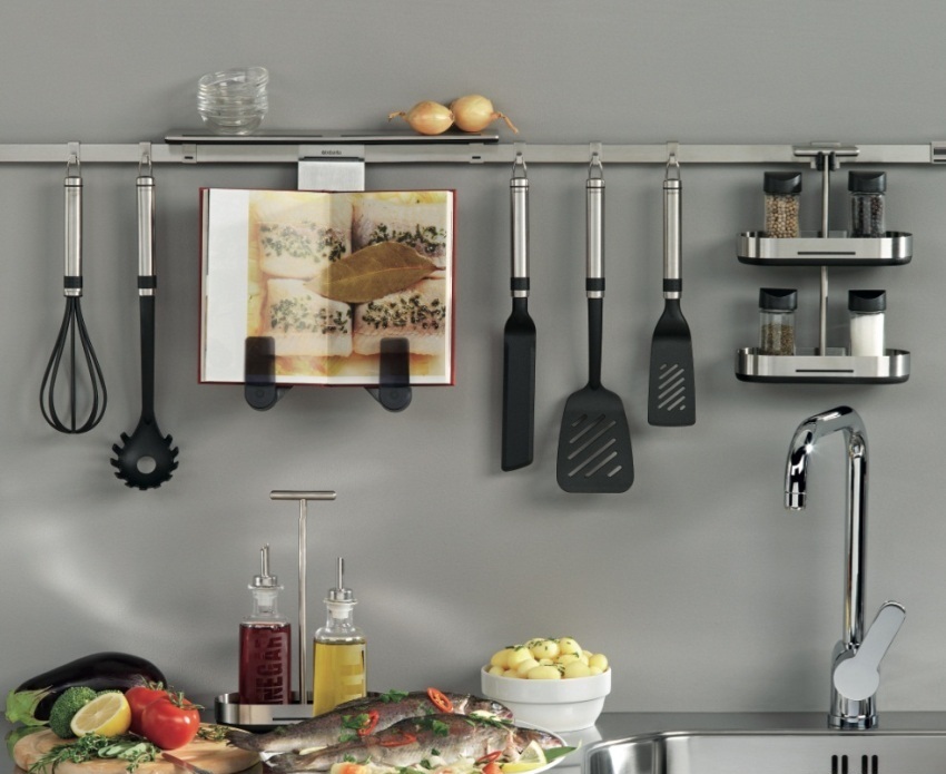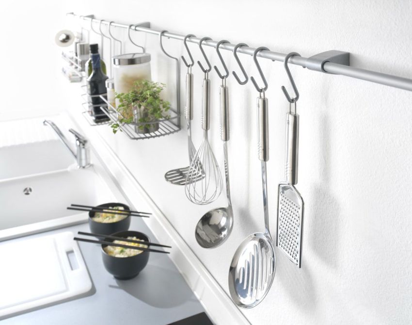 Lieden läheisyyteen voit ripustaa uunitukot, sähköisen sytyttimen, hyllyt mausteilla, lastalla kyljyksiä, kauhan ja ruoanlaittopihdit. Veitsijoukot on tarkoituksenmukaista sijoittaa työskentelyalueen päälle magneettipidikkeillä. Tiskialtaan yläpuolelle tulee sijoittaa ritilähylly astioiden ja leikkuulautojen säilyttämistä varten. On olemassa erityisiä pidikkeitä, jotka on varustettu hampailla ja jotka on suunniteltu sijoittamaan folio tai pakkauskalvo.