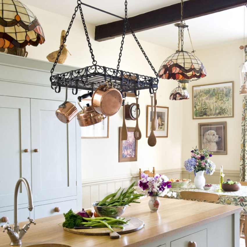 Provence-tyylille ohuet, keskipitkät suoraviivat rakenteet, joihin on sijoitettu S-muotoiset koukut. Keittiön himmeä kromikaide näyttää mielenkiintoiselta. Amerikan ja Kalifornian suuntiin, joita käytetään pääasiassa tilaviin huoneisiin tai studioihin, ripustettujen rakenteiden erilaiset muunnelmat näyttävät harmonisilta, joihin voit sijoittaa keittiövälineiden lisäksi myös kukkaruukkuja, kauniita koreja tai valkosipulia ja sipulia. Tämä antaa huoneelle omaperäisyyden ja täyttää ilmapiirin mukavuudella ja harmonialla luonnon kanssa.
