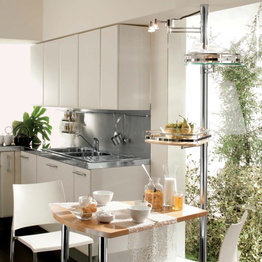 Jos valitset kaidejärjestelmän vankan rakenteen ja varustat sen tilavilla hyllyillä, voit sijoittaa tähän pienikokoisia kodinkoneita vedenkeittimen tai leivänpaahtimen muodossa. Tämä ratkaisu helpottaa työpintaa.