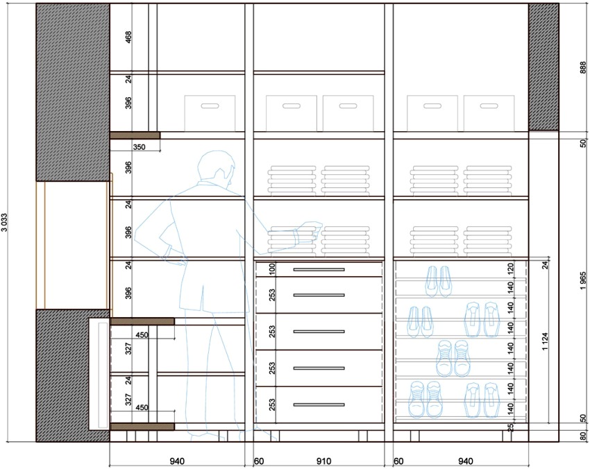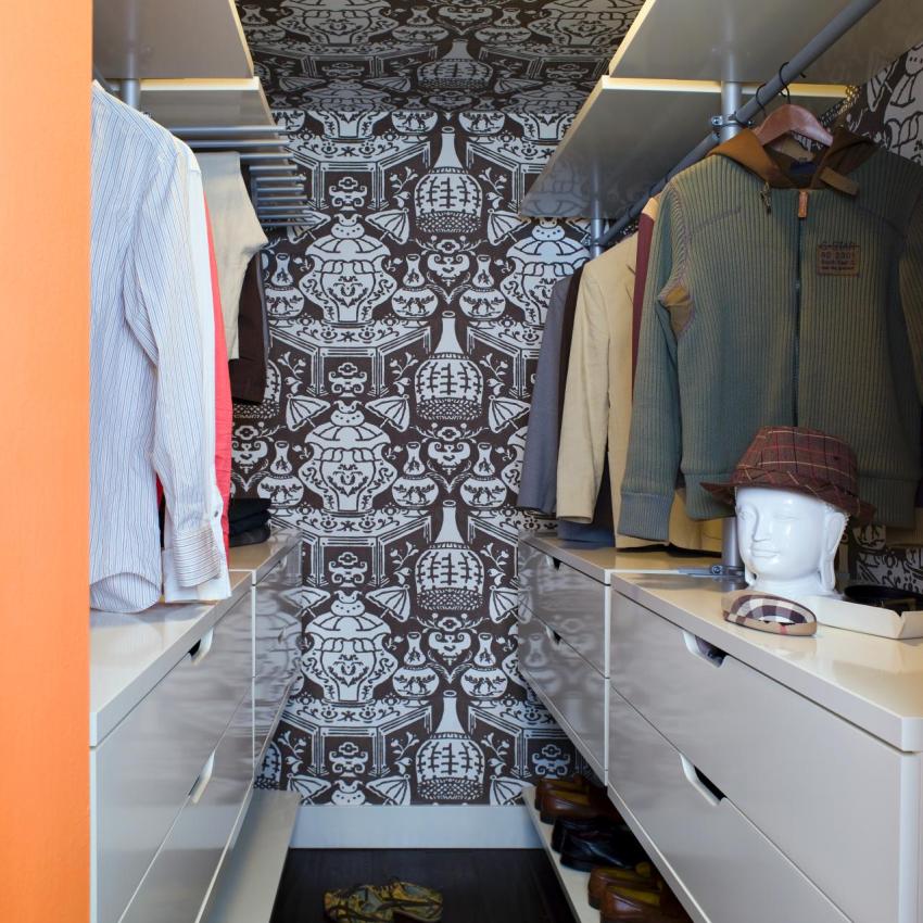 Erityisen sopiva ja käytännöllinen pienikokoisille vaatekaappien säilytysjärjestelmille, joiden rakenneosia voidaan siirtää itsenäisesti. Tällaiseen sisäiseen täyttöön ei yleensä liity pelkästään järjestelmän osien liikkumista, vaan myös telineiden, laatikoiden ja ripustimien määrän säätelyä. Kaikkien osien liikkuvuuden vuoksi pukuhuone on eräänlainen muuntaja, joka voidaan helposti säätää haluttuun kokoon. Kuva pienistä pukeutumistiloista, joissa on liikkuva täyte, auttaa valitsemaan sopivan järjestelmän.