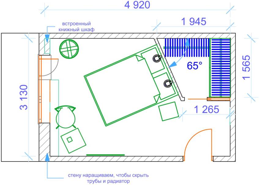 Pienissä makuuhuoneissa olevista vaatekaappien kuvasta näet huonekalujen järjestelyn, jotka on suunnattu yhdensuuntaisesti ja kohtisuoraan tuloksena olevaan viistettyyn seinään. On huomattava, että pukuhuoneen kulmainen sijoittelu voidaan toteuttaa myös lasten, olohuone tai eteinen. Tämä järjestely ei vaikuta pinta-alaltaan jo pienten tilojen visuaaliseen havaintoon. Kuva käytävän pukuhuoneista voi toimia esimerkkinä versiostasi.