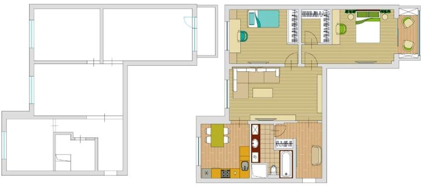 Jos huoneiston pohjaratkaisu ei vastaa täysin toiveitasi, sitä voidaan muuttaa. Riittää kerätä kaikki tarvittavat asiakirjat ja kehittää uudelleen.Tietysti tämä vie paljon aikaa ja vaivaa, mutta voit laajentaa sitä osaa huoneistosta, joka on eniten kysyttävää perheellesi. Ja tällä on tietysti positiivinen vaikutus mukavuuteen asua siinä.