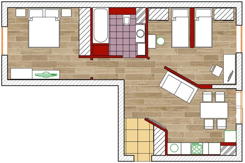 Yksi parhaista vaihtoehdoista 2 huoneen huoneiston uudelleenrakentamiseksi on jakaa suuri huone kahteen pieneen. Tämä on loistava ratkaisu perheelle, jossa on kaksi eri sukupuolta olevaa lasta, joista jokaisella on mahdollisuus saada oma huone. Toinen huone on tässä tapauksessa varattu vanhempien makuuhuoneelle. Keittiöllä on myös olohuoneen rooli, joten on suositeltavaa yhdistää se loggiaan tai parvekkeeseen.