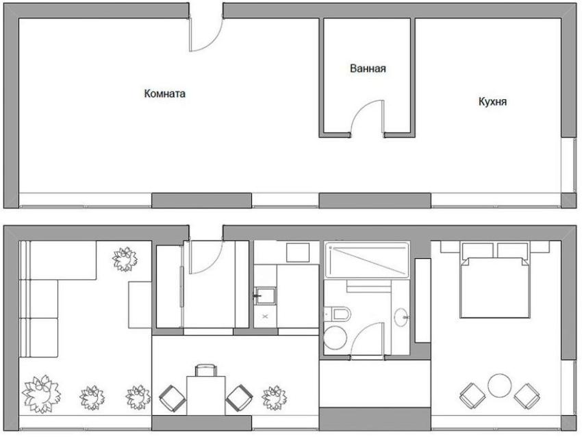 Se tapahtuu myös päinvastoin, kun omistajat haluavat tehdä studion yhden huoneen huoneistosta. Tässä tapauksessa sinun on toimittava keittiön ja huoneen yhdistämisen tavanomaisen järjestelmän mukaisesti. Internetissä on helppo löytää esimerkki tämän tyyppisen huoneiston uudistamisprojektista. Tällä tavoin huoneiston kunnostushankkeen hinta on alin.