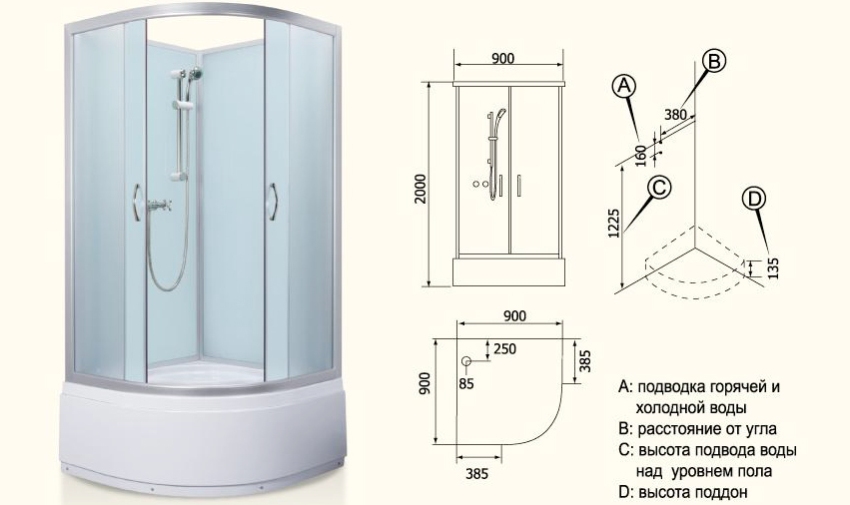 Kulmasuihkukaappi 90x90 korkealla: asennusominaisuudet