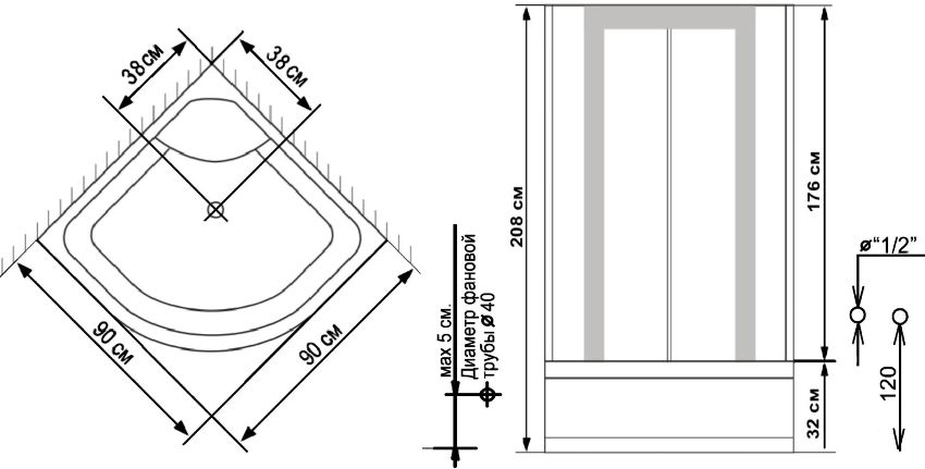 Kun ostat suihkukaapin, sinun ei tarvitse huolehtia liemestä. Mutta tämä osa suihkukaapista kuluu nopeasti ja se on vaihdettava. Tätä varten sinun on tiedettävä tyhjennysaukon halkaisija. Standardissa se on 45-60 cm.