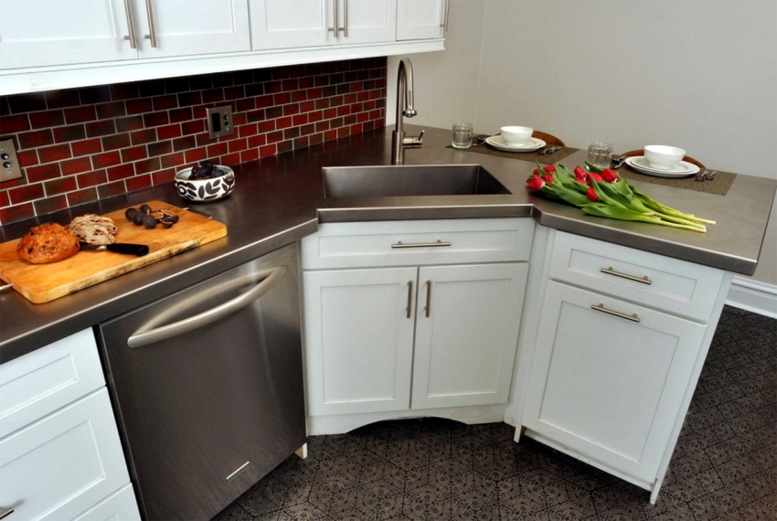 Kulmakeittiöiden edut ja haitat, joissa on pesuallas kulmassa: valokuva