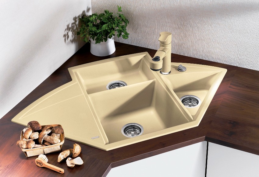 Tämän asennusmenetelmän etuna on hyödyllisen keittiötilan säästäminen. Corner mortise -mallit näyttävät erittäin vaikuttavilta ja yhdistyvät melkein kaiken tyyppisiin keittiövälineisiin. Tällaisia nieluja on paljon vaikeampaa asentaa itse. Tämä johtuu tarpeesta tarjota luotettava vedeneristys.