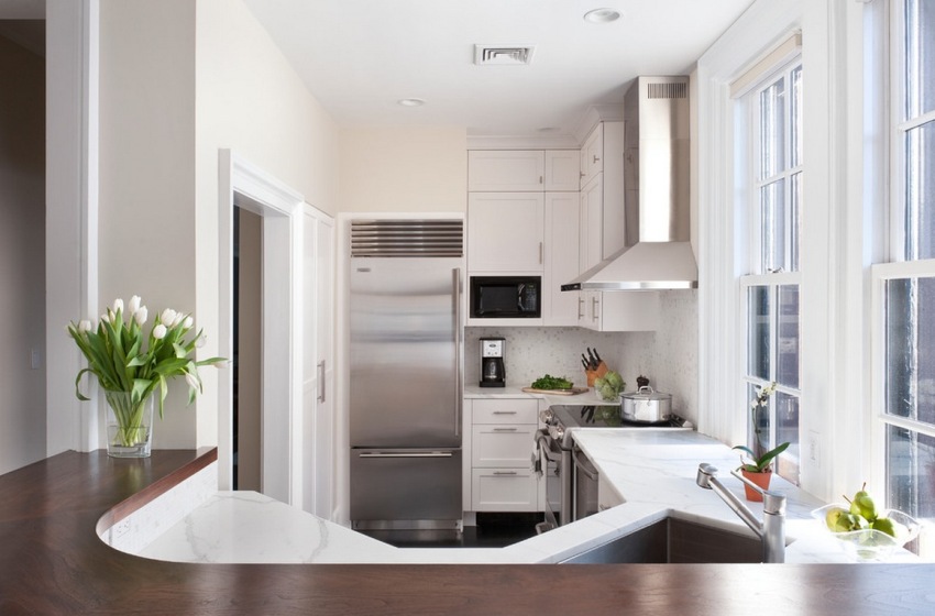 Tilan vapauttamiseksi keittiössä voit varustaa kulmikkaan kolmion, jonka keskipiste on keittiön pesuallas ja kaappi