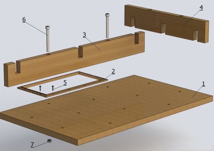 Kuva 1. Puumuotin rakentaminen päällystyslevyjä varten: 1 - pohja, 2 - sisäosa, 3 - pitkittäisseinä, 4 - poikittainen seinä, 5 - ruuvi, 6 - ruuvi, 7 - mutteri