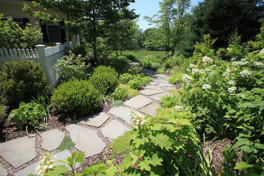 Polun ja puutarhakasvillisuuden yhdistelmä on hyvin omaperäinen ratkaisu, kun luodaan päällystyslevyjen koostumus yksityisen talon pihalle. Kuvia tällaisista poluista ja sivustoista kukkapenkit keskellä, muistuttavat kuvia autiomaasta.