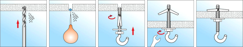 Ugradnja proizvoda započinje bušenjem rupe potrebnog promjera i potrebne dubine u stropu pomoću probijalice. Dalje se u nju umetne plastični tipli u koji se kuka pažljivo uvije na najveću moguću dubinu.