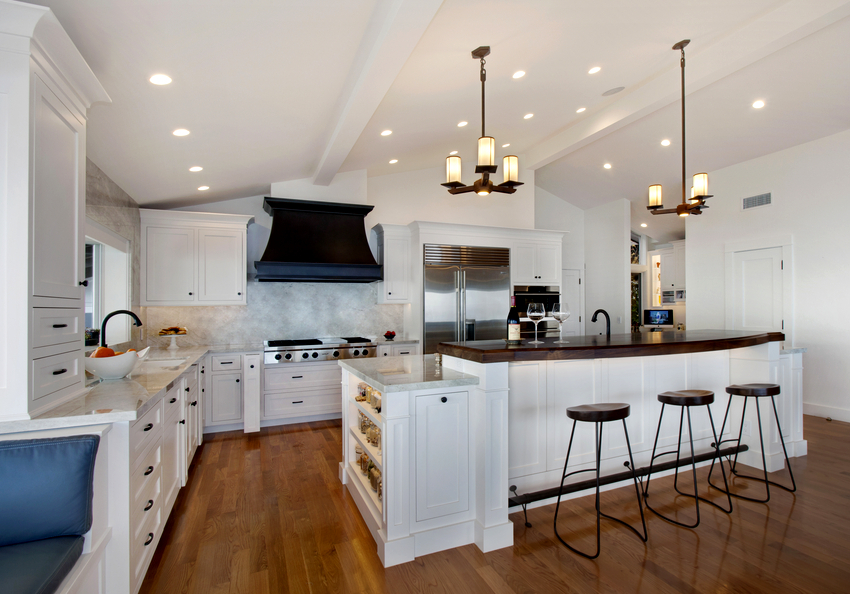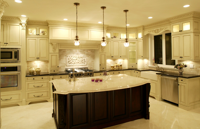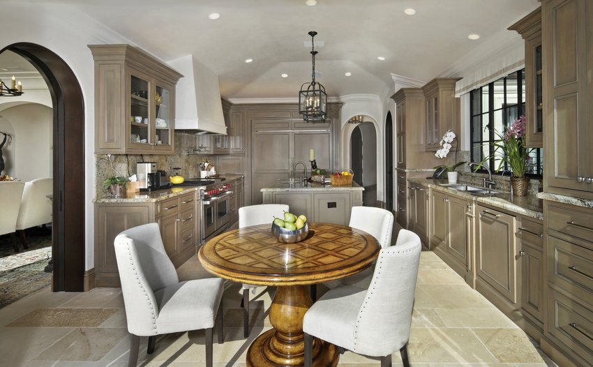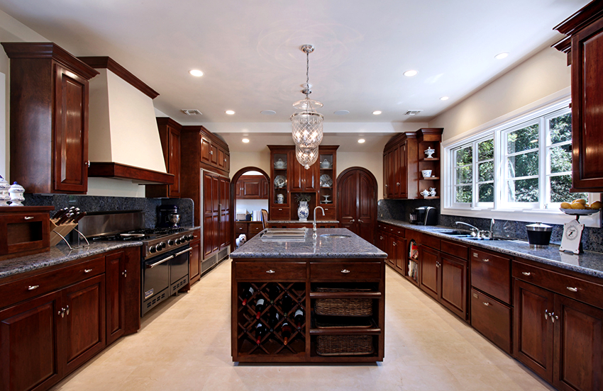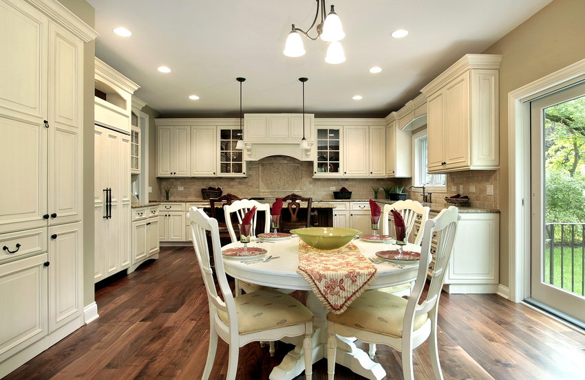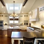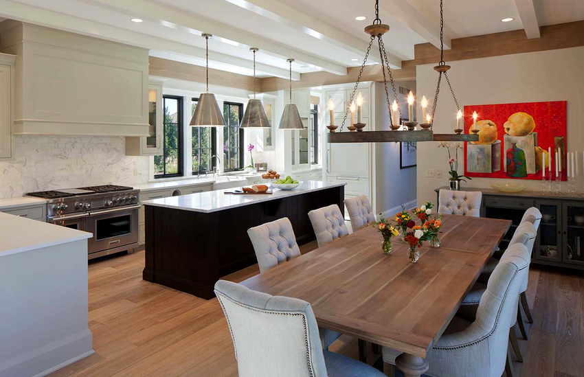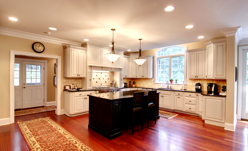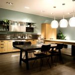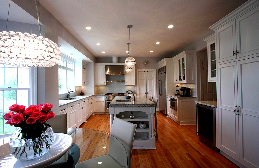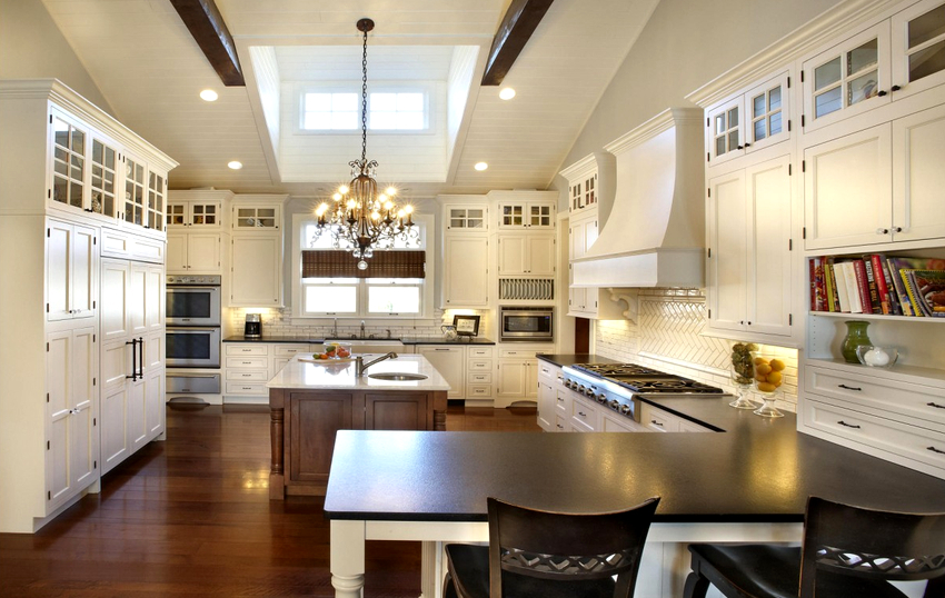 U prostranim kuhinjama bilo kojeg oblika, luster bi se trebao nalaziti iznad blagovaonskog stola na udaljenosti od najmanje 1,2-1,4 m od njega, što će isključiti mogućnost nelagode kod ljudi koji sjede iza njega. U tom je slučaju radna površina osvijetljena pomoću dodatnih lokalnih izvora.
