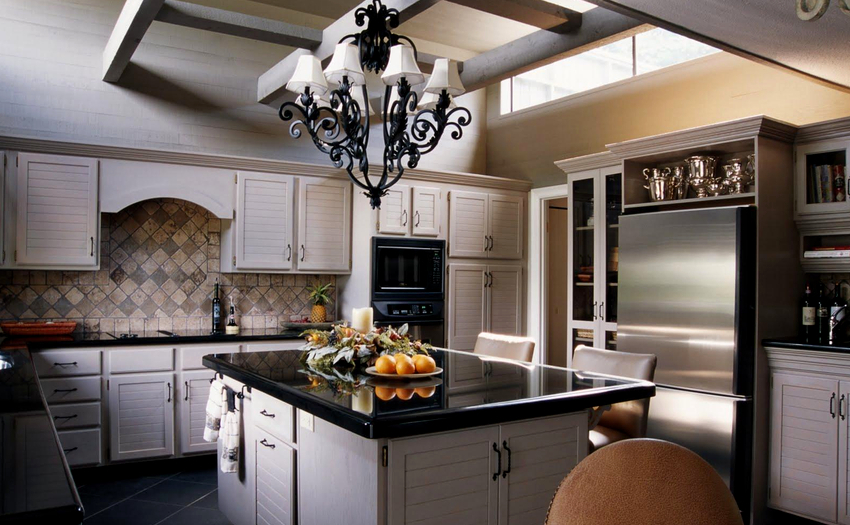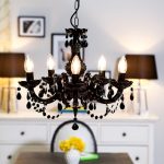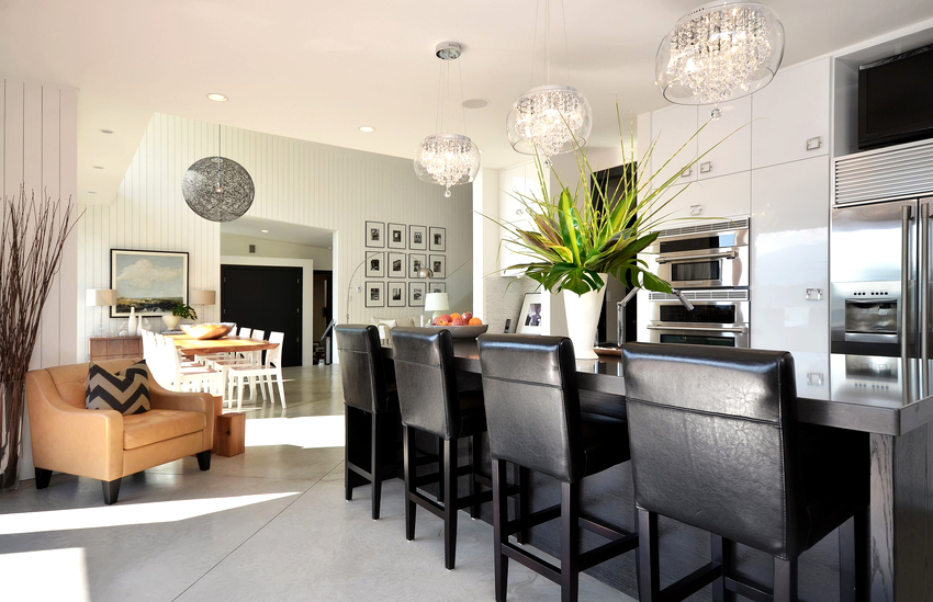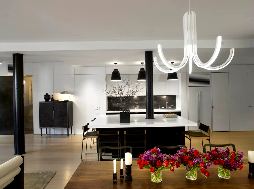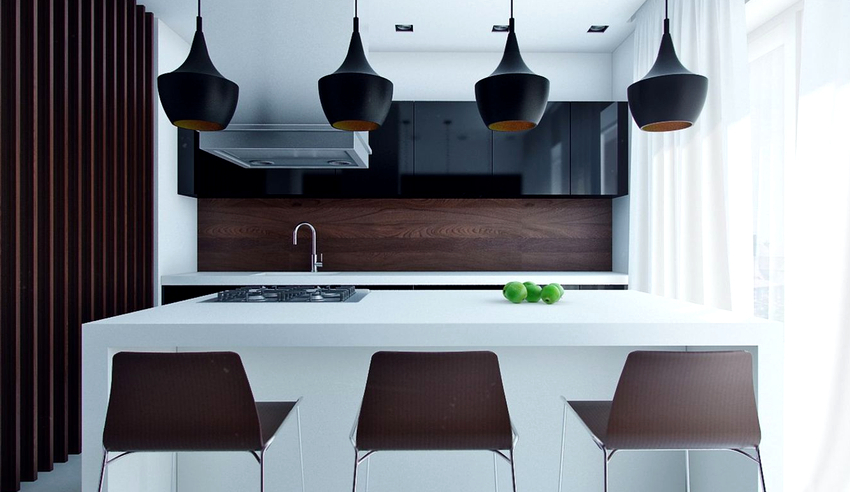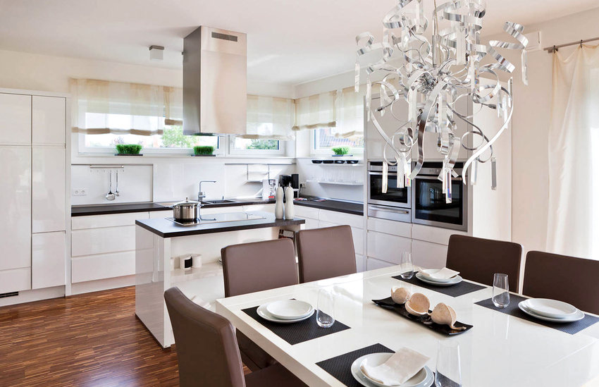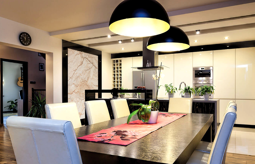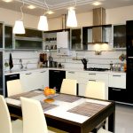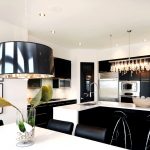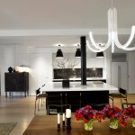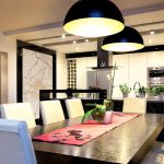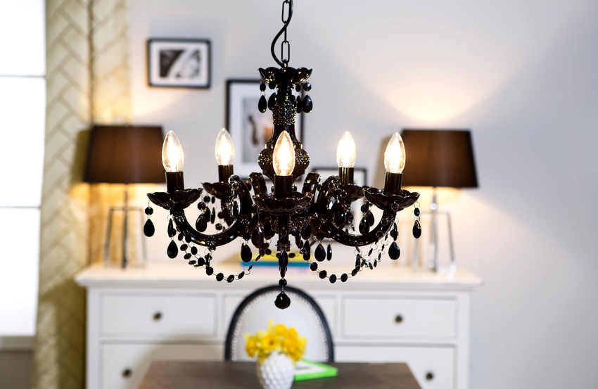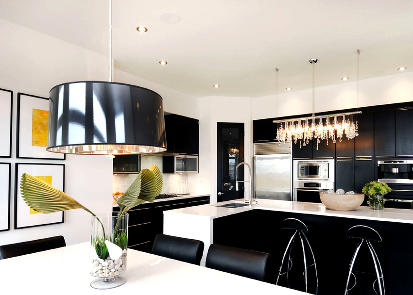Hrabro i nestandardno rješenje je ugradnja crnog lustera u kuhinju. Interijeru će dodati dašak drame, postajući neobičan detalj prostorije, koji se ne može previdjeti. Takav luster najbolje će zasjeniti snježnobijeli strop i dati izražajnost bijelom kuhinjskom kompletu, što je prikazano fotografijom lustera u unutrašnjosti.