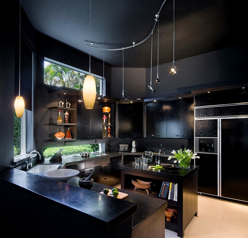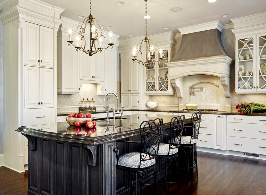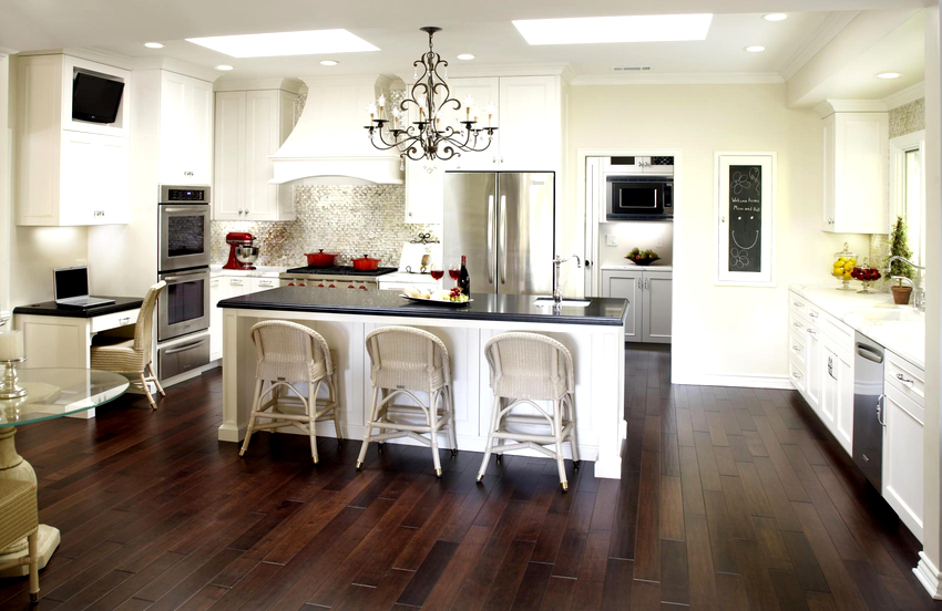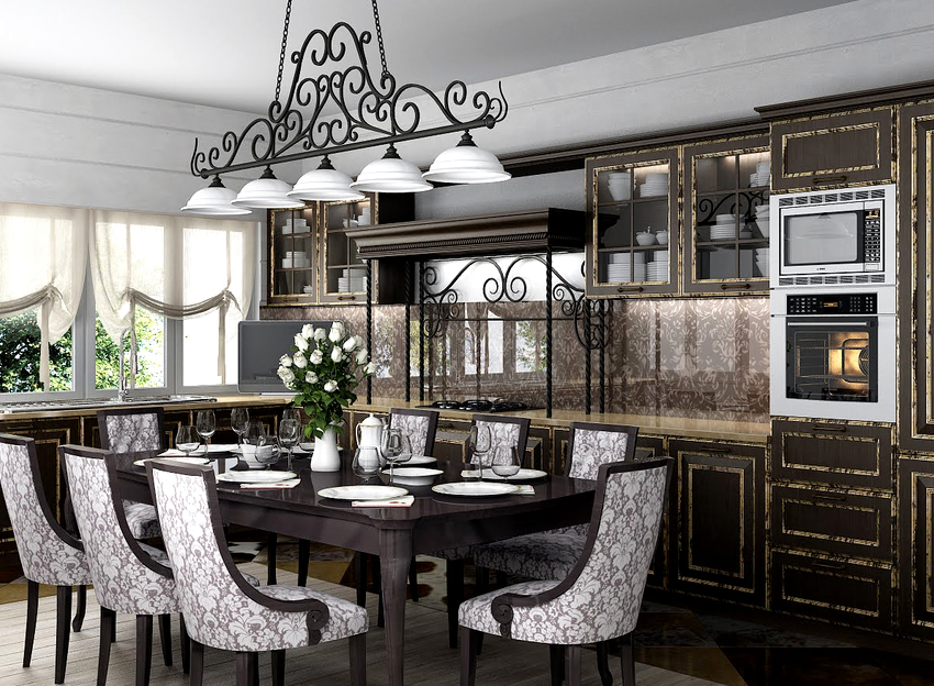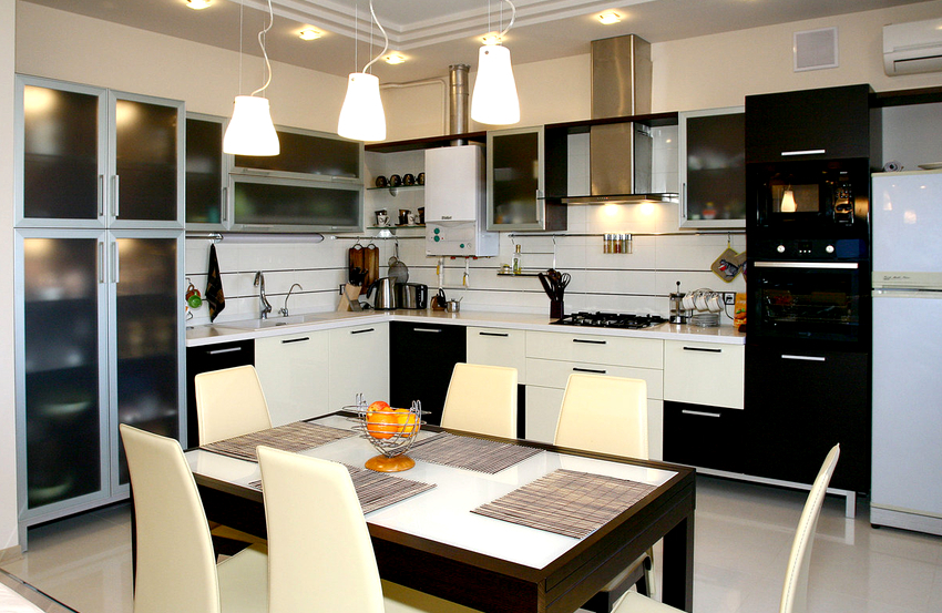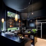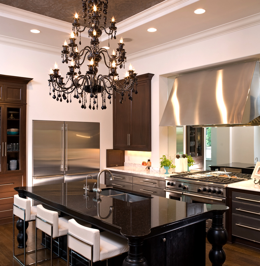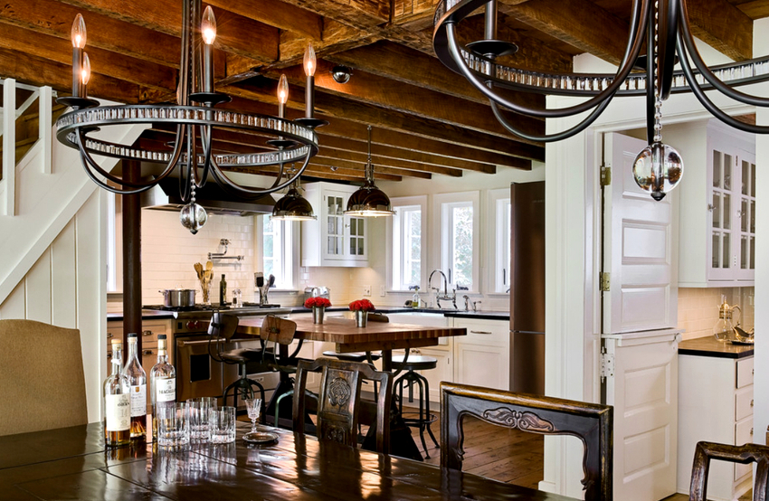 Hrabro i nestandardno rješenje je ugradnja crnog lustera u kuhinju. Interijeru će dodati dašak drame, postajući neobičan detalj prostorije, koji se ne može previdjeti. Takav luster najbolje će zasjeniti snježnobijeli strop i dati izražajnost bijelom kuhinjskom kompletu, što je prikazano fotografijom lustera u unutrašnjosti.