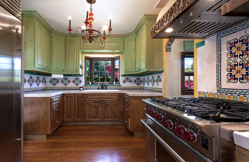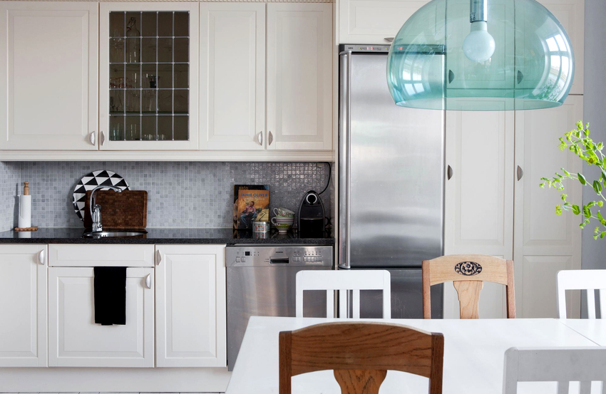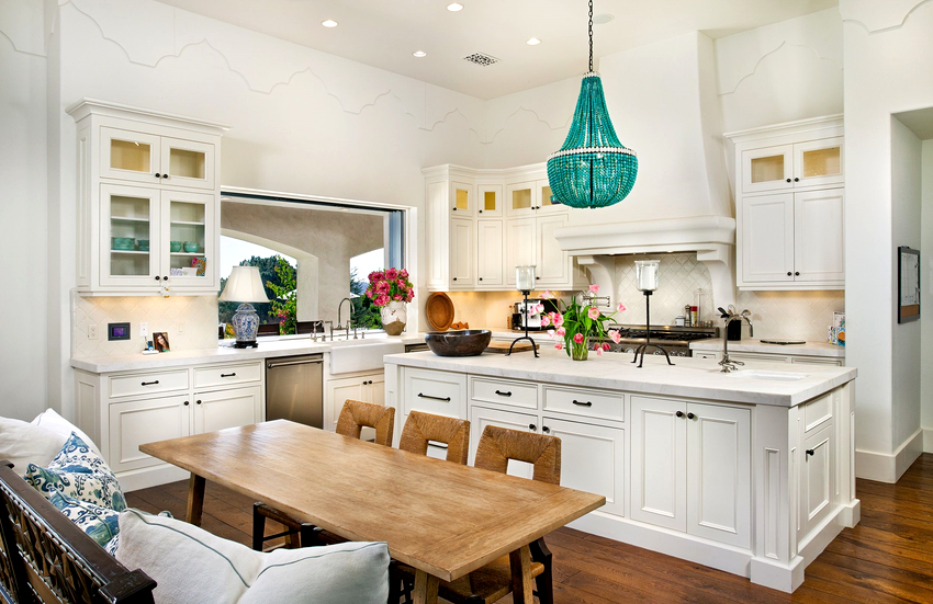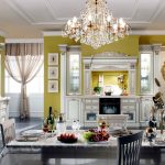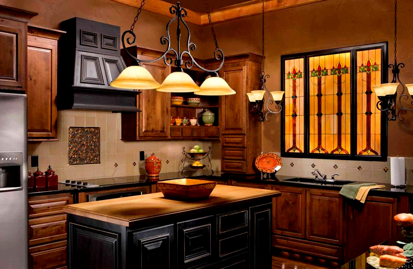 Najljepši luster od stakla Tiffany, ukrašen mozaicima ili slikama od vitraja, organski će se uklopiti u neoklasičnu kuhinju. Takav će proizvod postati izvrsna, svijetla i neobična opcija za uređenje interijera u boji.