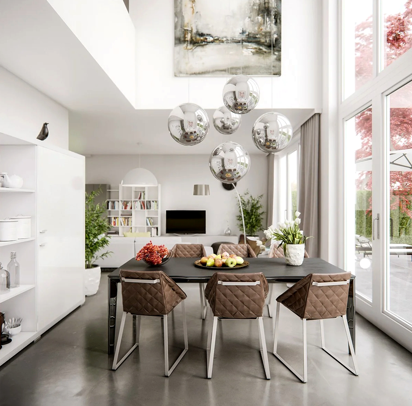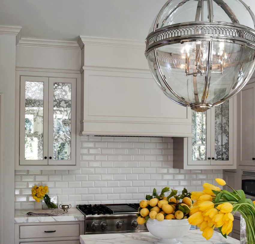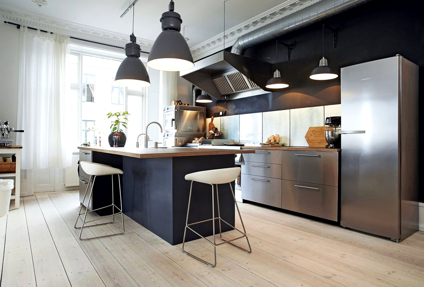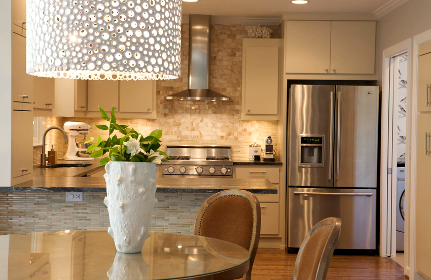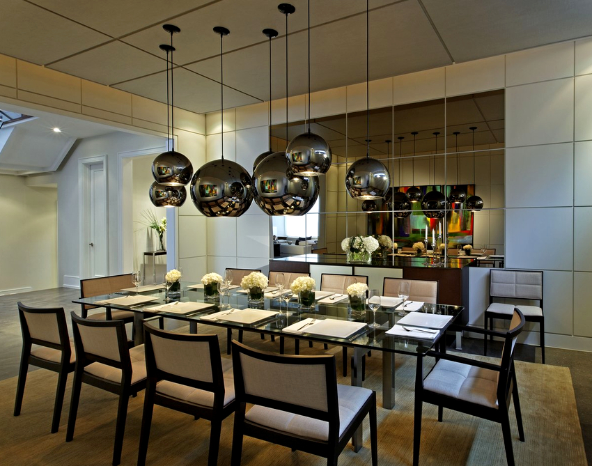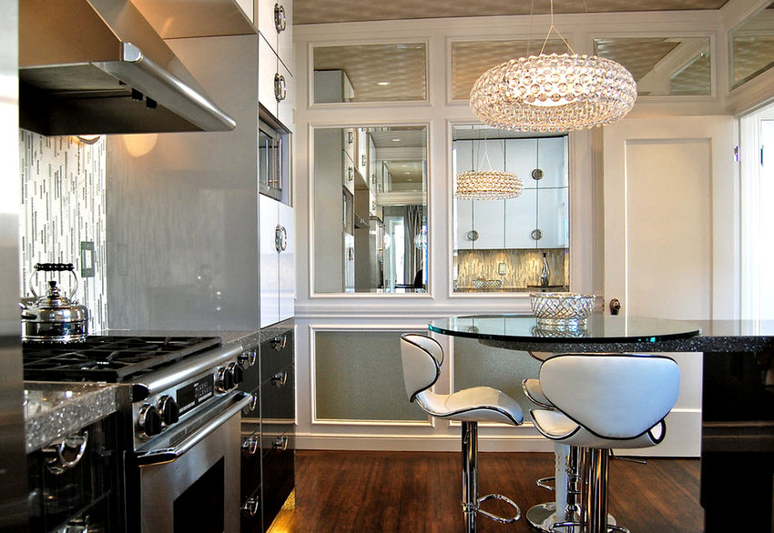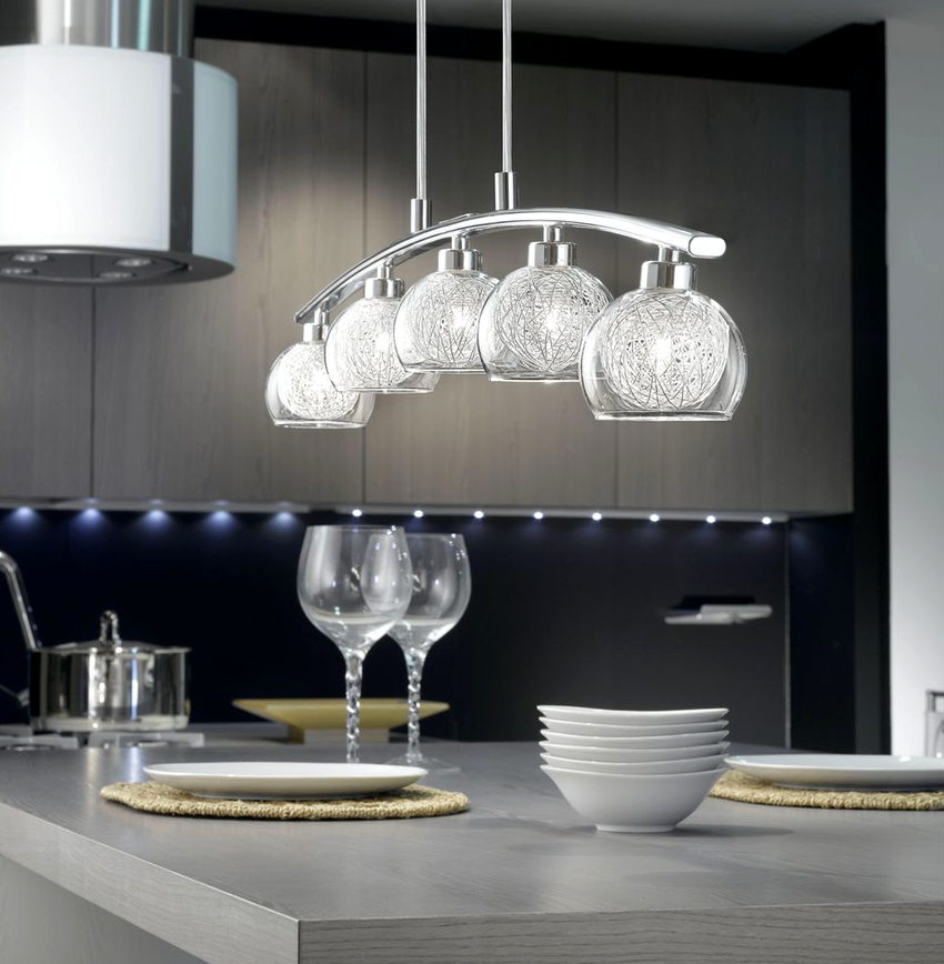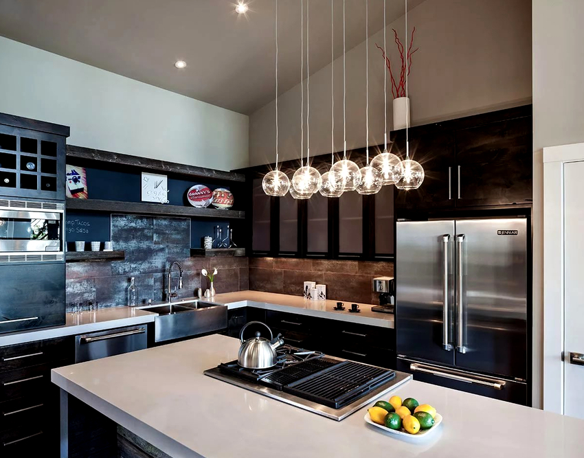 U kuhinji u modernom stilu, luster s kromiranim tijelom, nadopunjen metalnim umetcima, izgledat će povoljno. Nijanse su u ovom slučaju izrađene od prozirnog stakla.