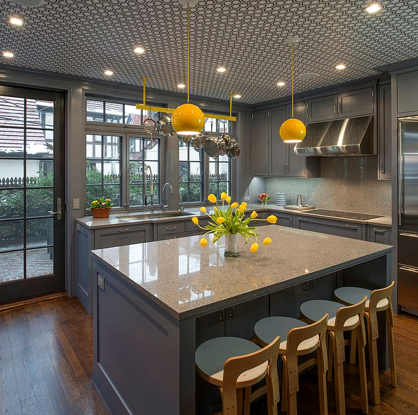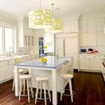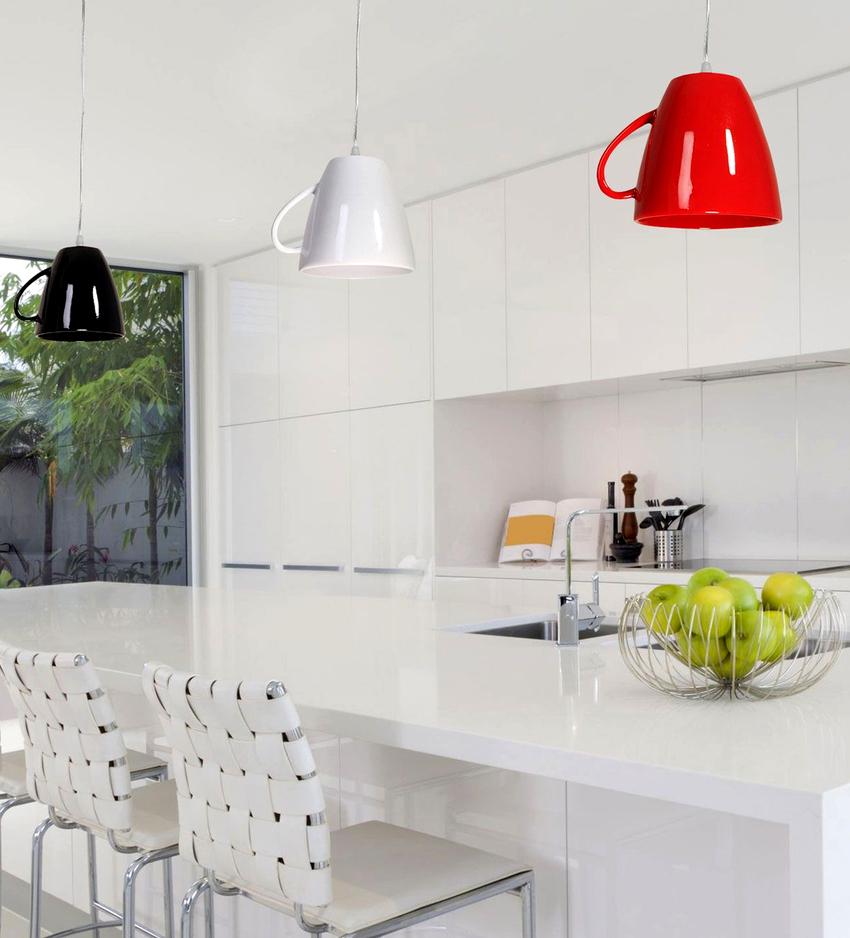 Rasvjetna tijela plave, plave ili tirkizne boje izgledaju svježe i originalno u bilo kojem interijeru. Za sivo-bijelu sobu, najbolja opcija bit će žuti luster, koji će ispuniti kuhinju toplinom i udobnošću.