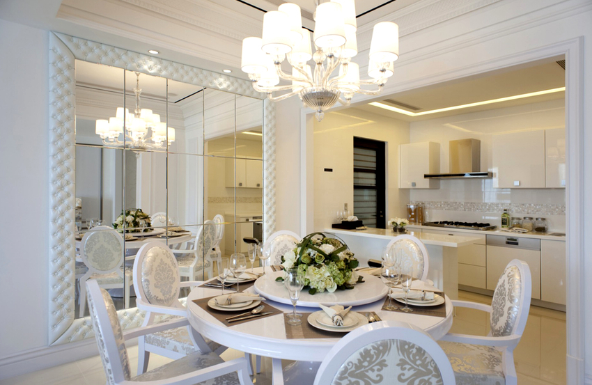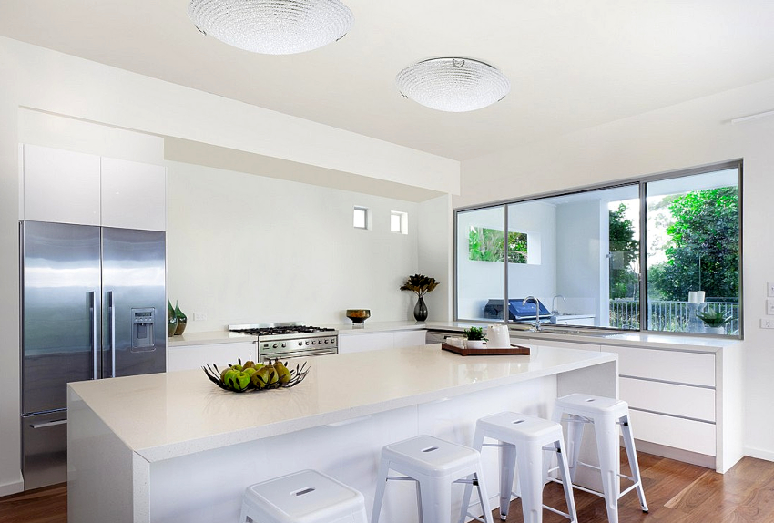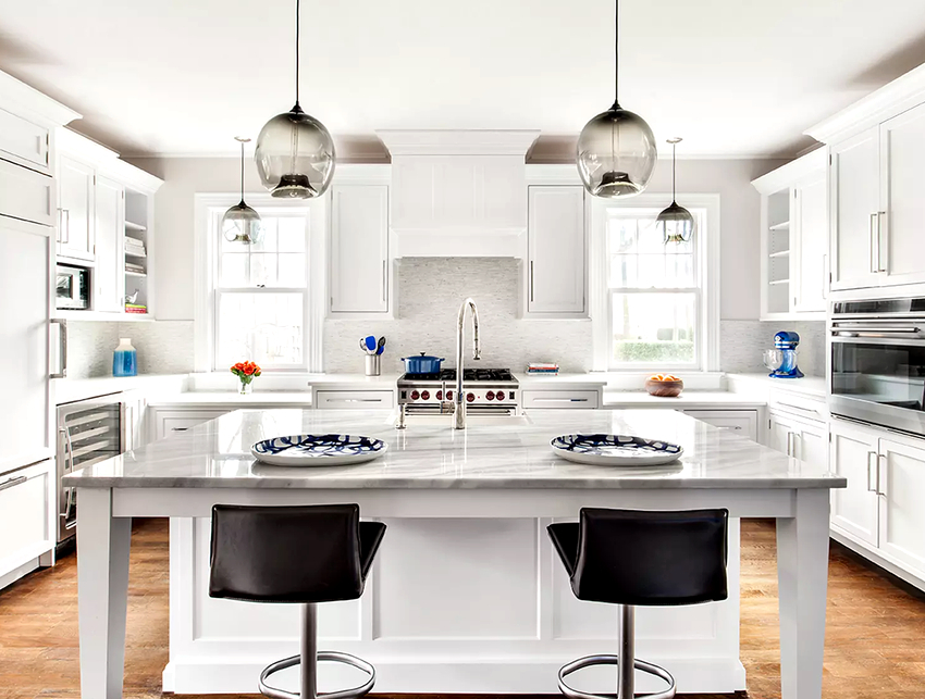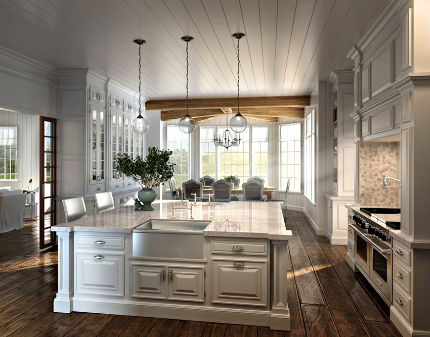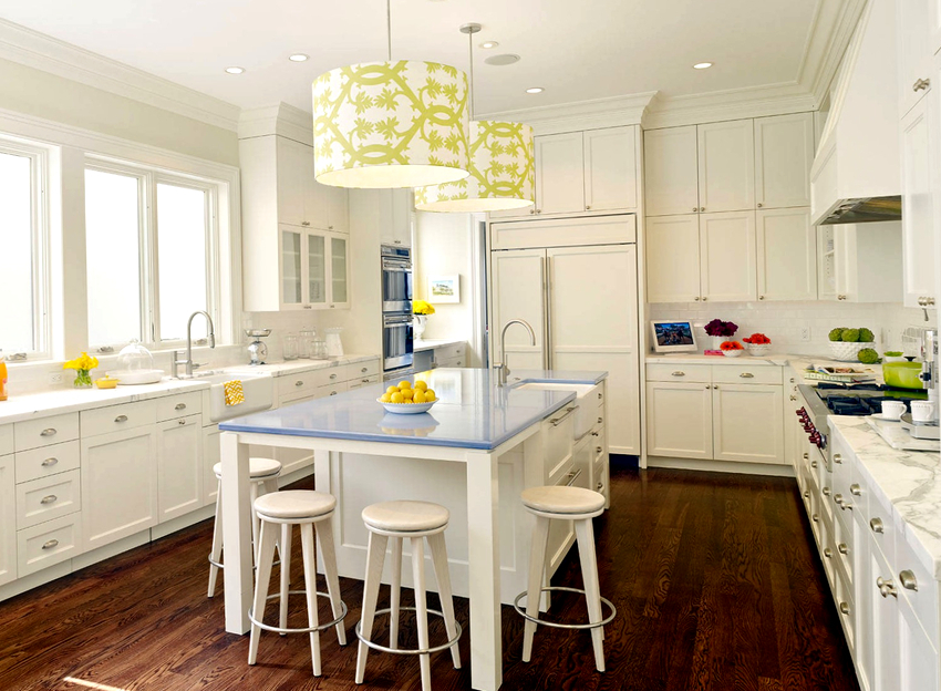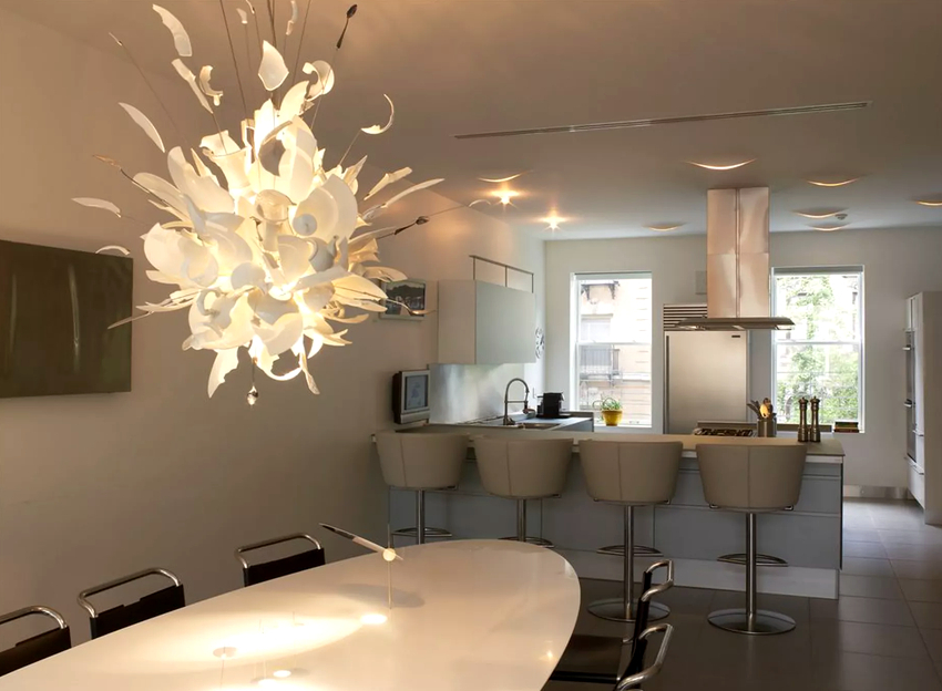 Snježno bijeli proizvod može se uklopiti u bilo koji stil interijera. Može se izrađivati od matiranog stakla, kristala ili neprozirne plastike. Takav rasvjetni uređaj izgledat će povoljno u kombinaciji s drvenim namještajem i laganom završnom obradom sobe. Luster se može skladno otopiti u dizajnu bijelo-sive kuhinje s laganim i prozračnim interijerom.