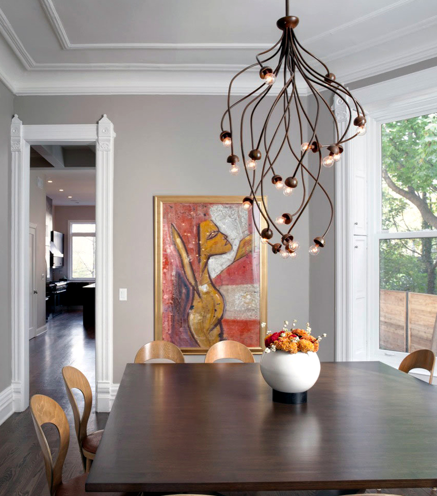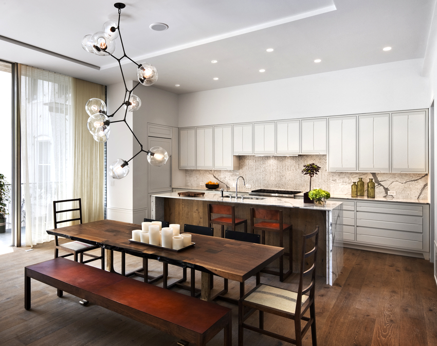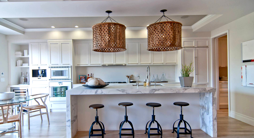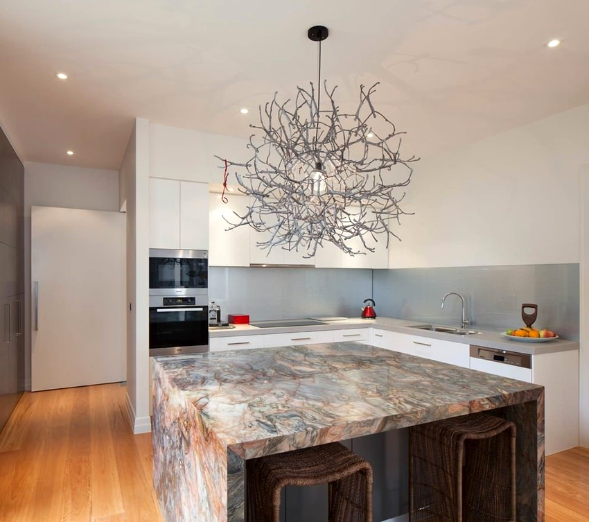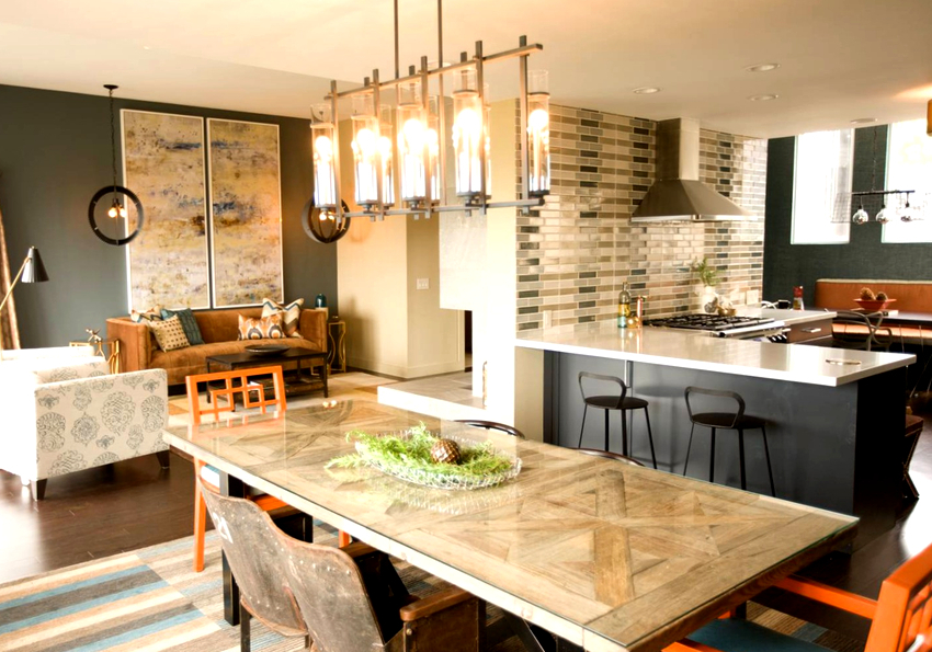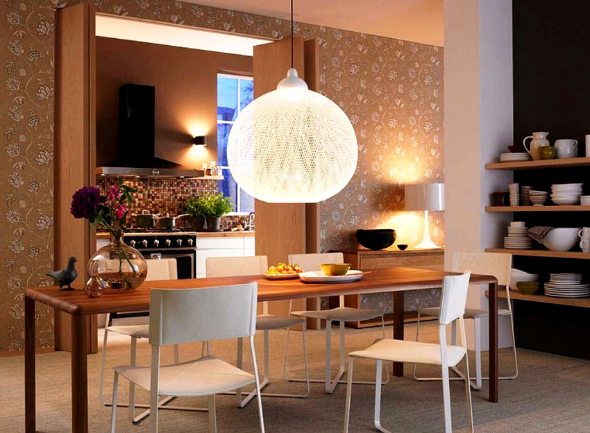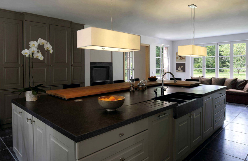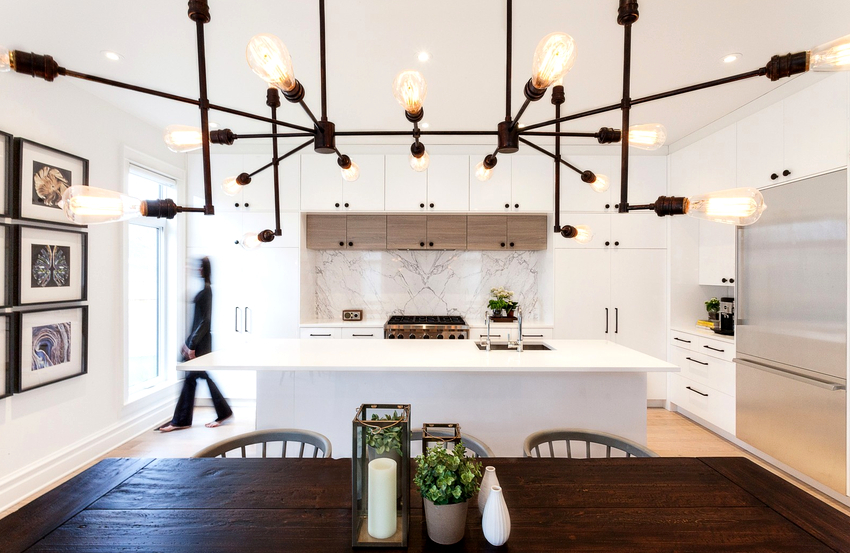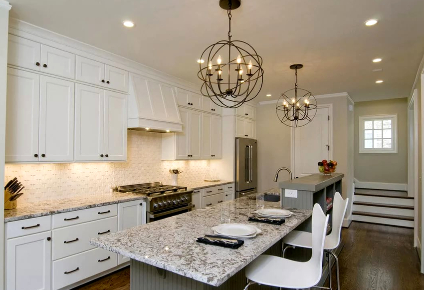 Ovješena konstrukcija je rasvjetni uređaj koji se sastoji od jedne ili više nijansi koje su pričvršćene na žicu, lanac ili kabel na stropu, što je jasno prikazano na fotografiji lustera u unutrašnjosti kuhinje. Takvi se proizvodi mogu prilagoditi po visini, što vam omogućuje odabir potrebnog intenziteta osvjetljenja.