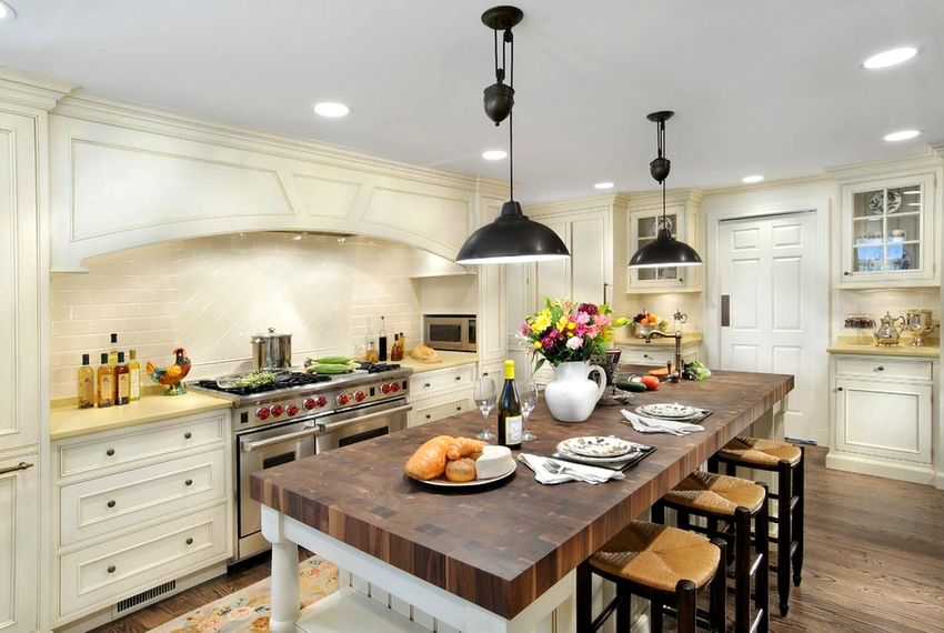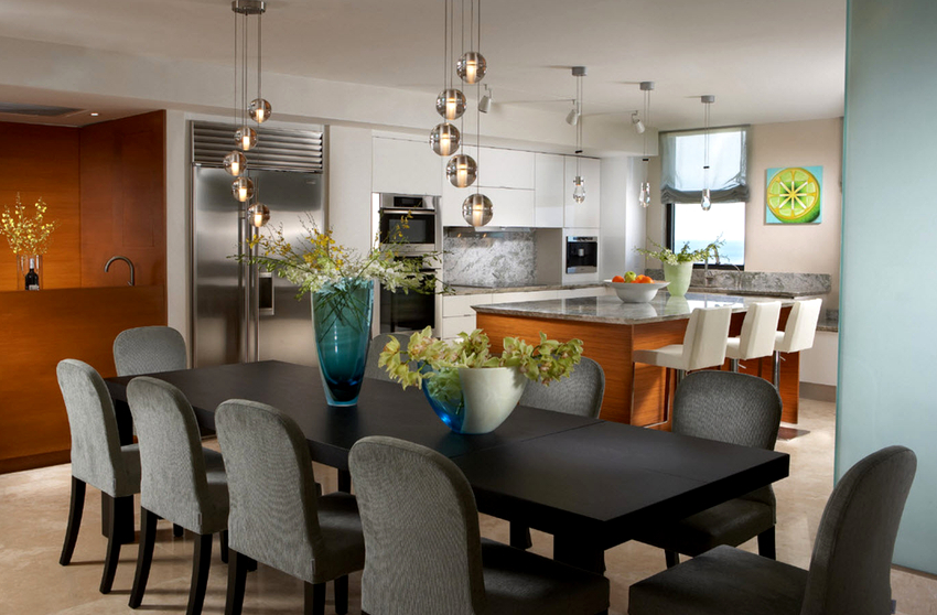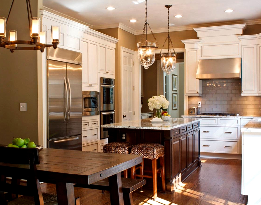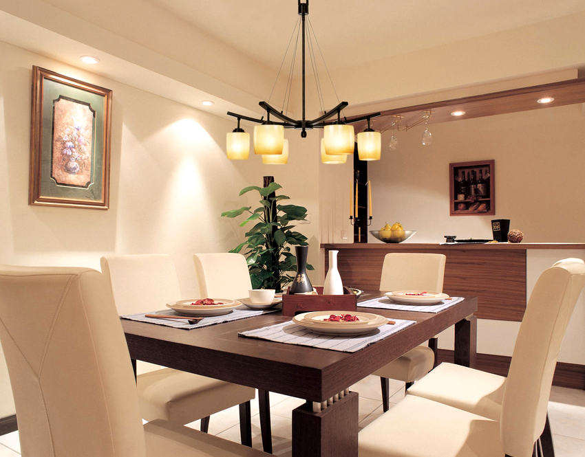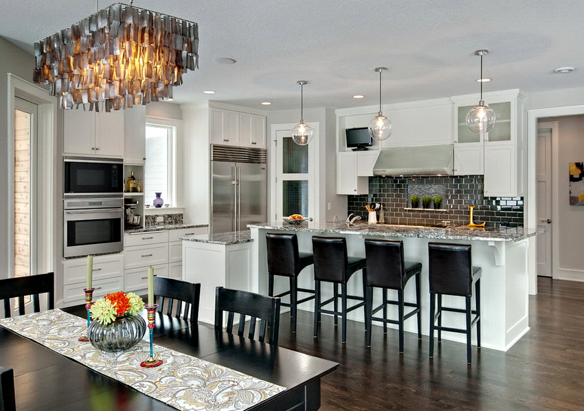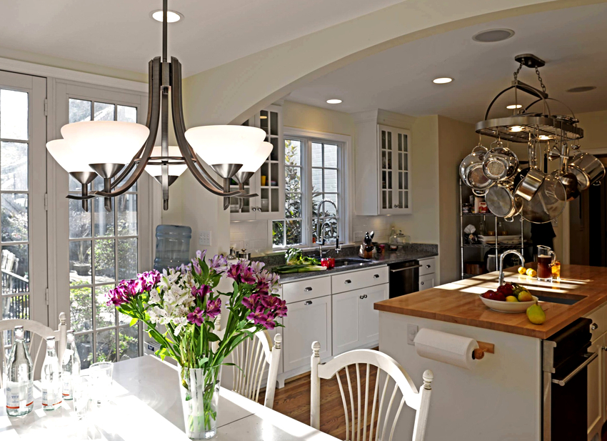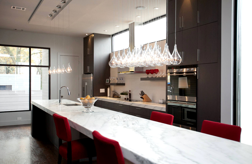 Osvjetljenje se može nalaziti u središnjem dijelu prostorije ili postaviti iznad stola u kuhinji. U prvom slučaju, luster pruža optimalno osvjetljenje dvije zone odjednom: blagovaonice i rada. U drugom slučaju, uređaj će tijekom kuhanja biti iza leđa, ne pružajući dovoljnu razinu osvjetljenja radnog mjesta. Stoga ćete ovdje trebati instalirati dodatni izvor svjetlosti. Ako kuhinja ima kutni položaj, iznad svakog područja možete objesiti mali luster.