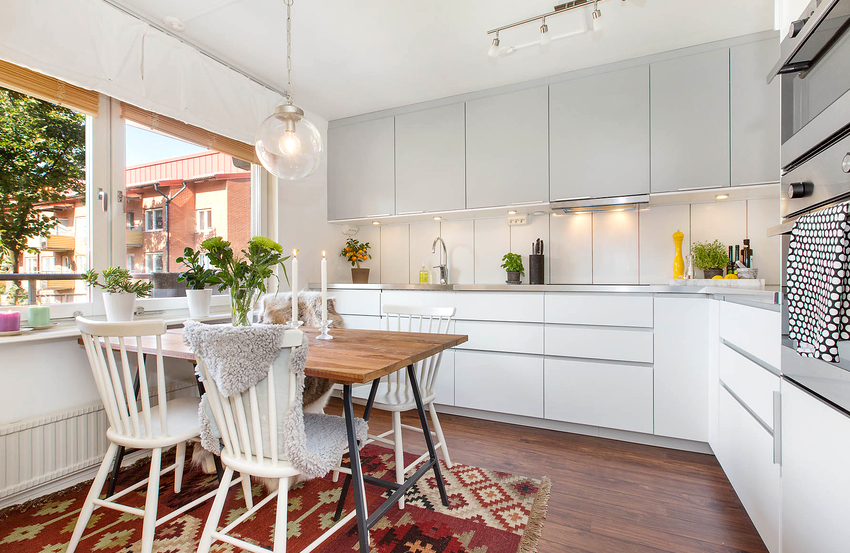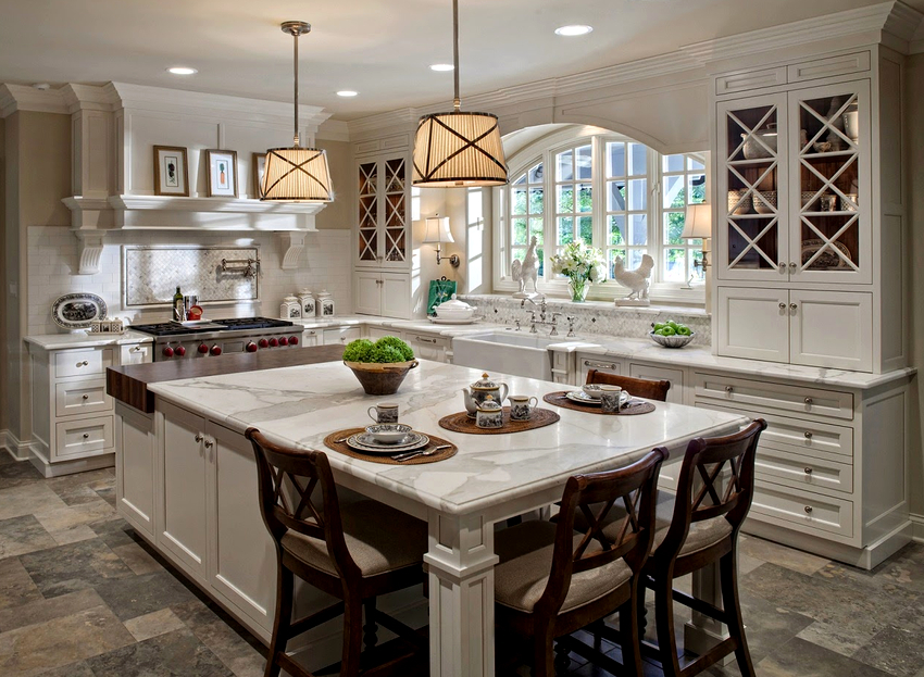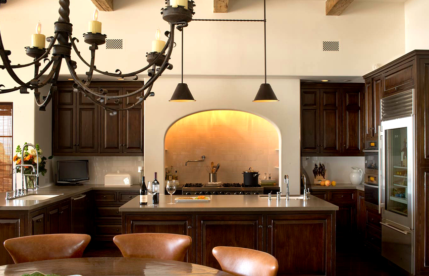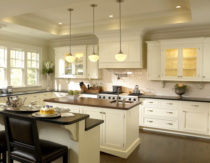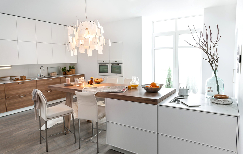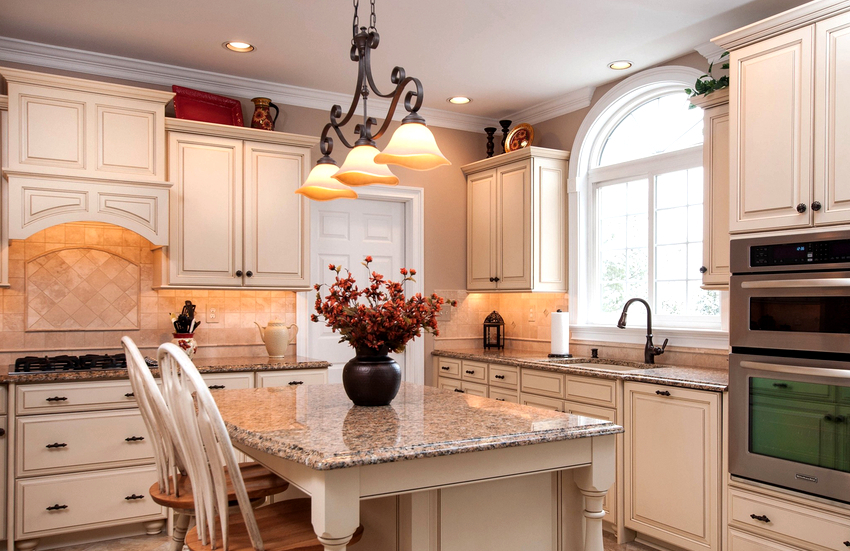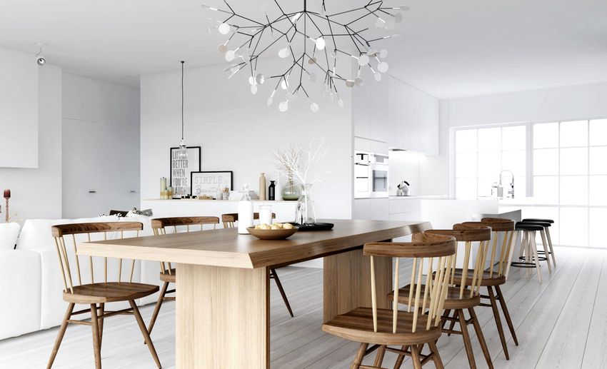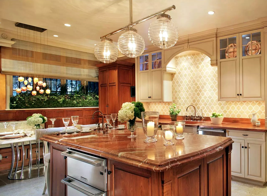 Osvjetljenje se može nalaziti u središnjem dijelu prostorije ili postaviti iznad stola u kuhinji. U prvom slučaju, luster pruža optimalno osvjetljenje dvije zone odjednom: blagovaonice i rada. U drugom slučaju, uređaj će tijekom kuhanja biti iza leđa, ne pružajući dovoljnu razinu osvjetljenja radnog mjesta. Stoga ćete ovdje trebati instalirati dodatni izvor svjetlosti. Ako kuhinja ima kutni položaj, iznad svakog područja možete objesiti mali luster.