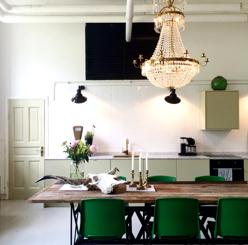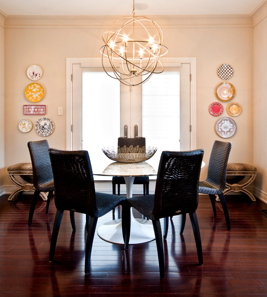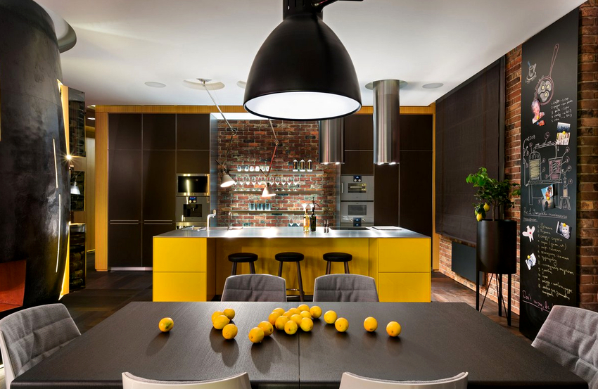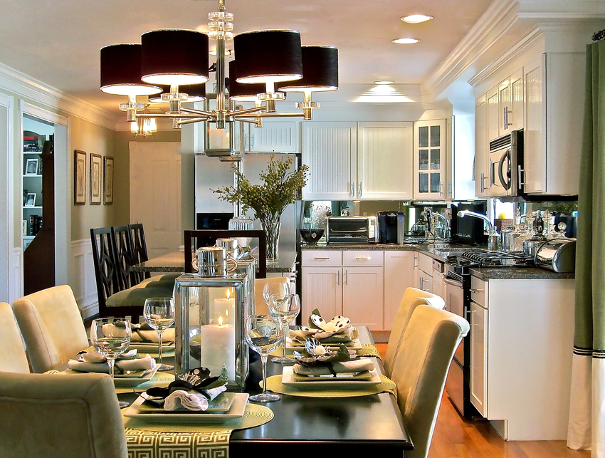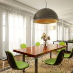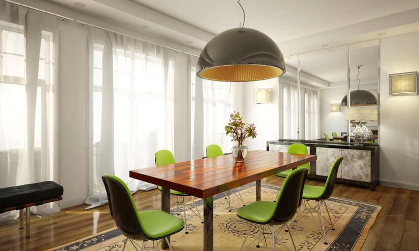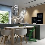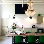 Zelena nijansa izgleda dobro u kombinaciji s crnim elementima. Takav će tandem dati interijeru intimnost i udobnost, čineći sobu omiljenim mjestom za zajedničko druženje svih članova obitelji. Skladne kombinacije boja prikazane su na fotografiji lustera u kuhinji.