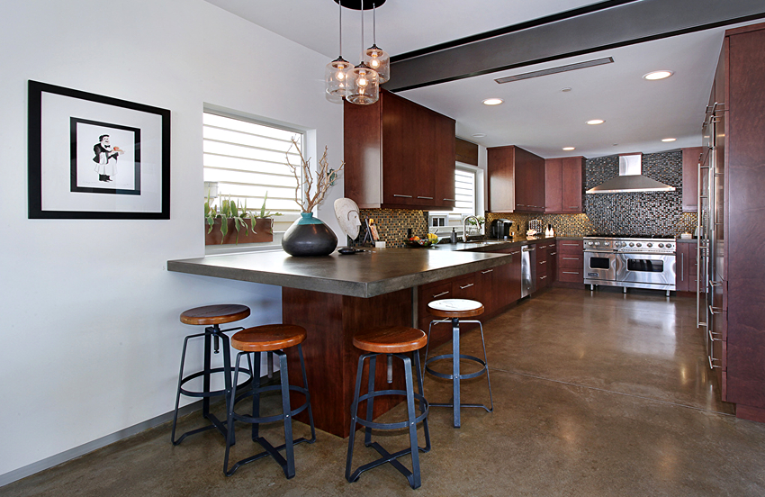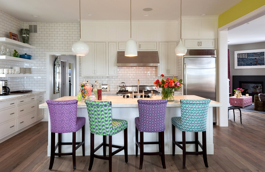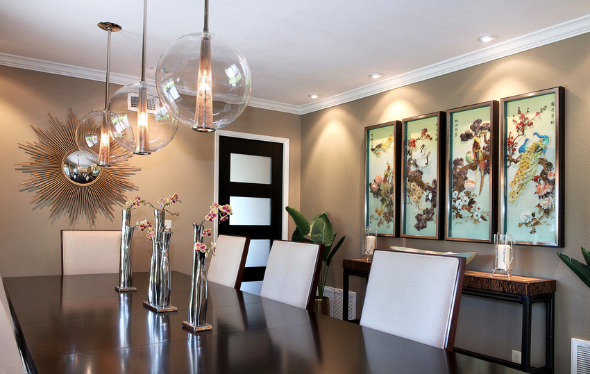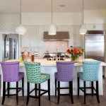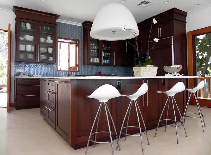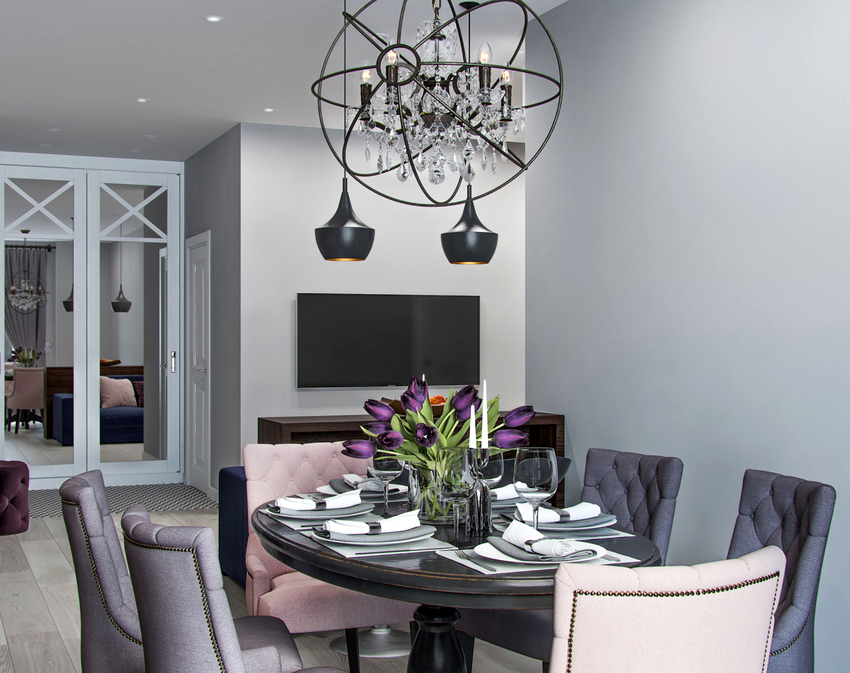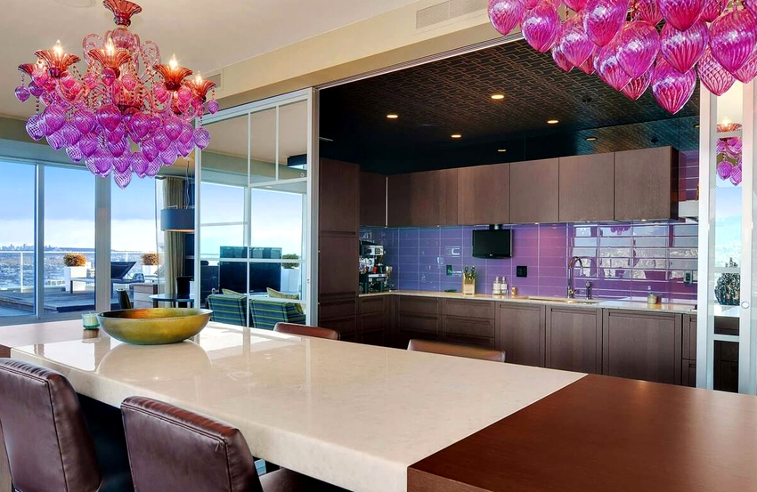 Za orijentalnu kuhinju prikladan je ljubičasti luster. Takav svijetli, dominantni element mora biti uravnotežen bež oblogom i laganim namještajem. Da biste dovršili dizajn, ljubičastu treba ponoviti u tekstilu ili presvlakama.