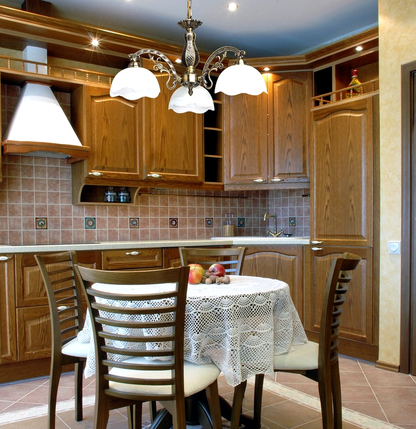 Luster u kuhinji trebao bi osigurati dovoljno osvjetljenja za sobu, stvarajući ugodnu i ugodnu atmosferu. Iznad radnog prostora i prostora za jelo trebalo bi biti jako svjetlo. U tu svrhu za rasvjetne uređaje odabiru se fluorescentne ili halogene žarulje sa žarnom niti s dovoljnom razinom snage.