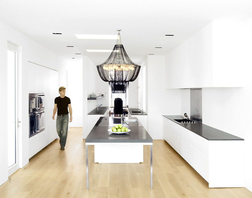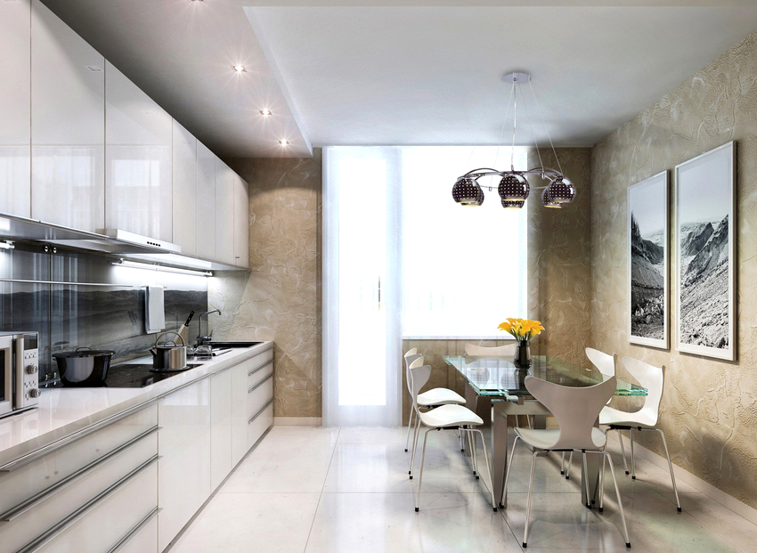 Kako odabrati luster za izduženu kuhinju? Za takvu sobu trebali biste odabrati takve mogućnosti za lustere, koji se sastoje od nekoliko nijansi smještenih na istoj liniji. Ovo rješenje ravnomjerno će osvijetliti čitav kuhinjski prostor. Par malih lustera postavljenih bliže uskim zidovima prostorije izgledat će organski.