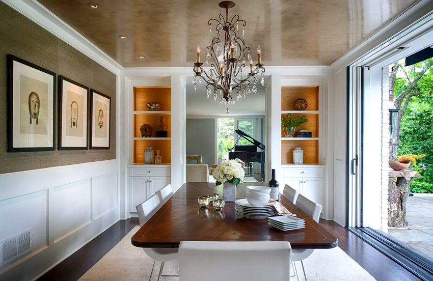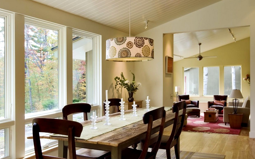 Snaga svjetlosnog toka izravno ovisi o materijalu koji se koristi za sjenilo. Prozirni otvoreni elementi pružaju izvrstan protok svjetlosti, a obojene ili tamne, poput zatvorenih, karakterizira slaba propusnost svjetlosti, kao što je prikazano na fotografiji lustera za malu kuhinju.