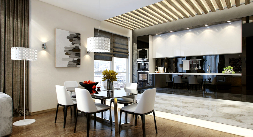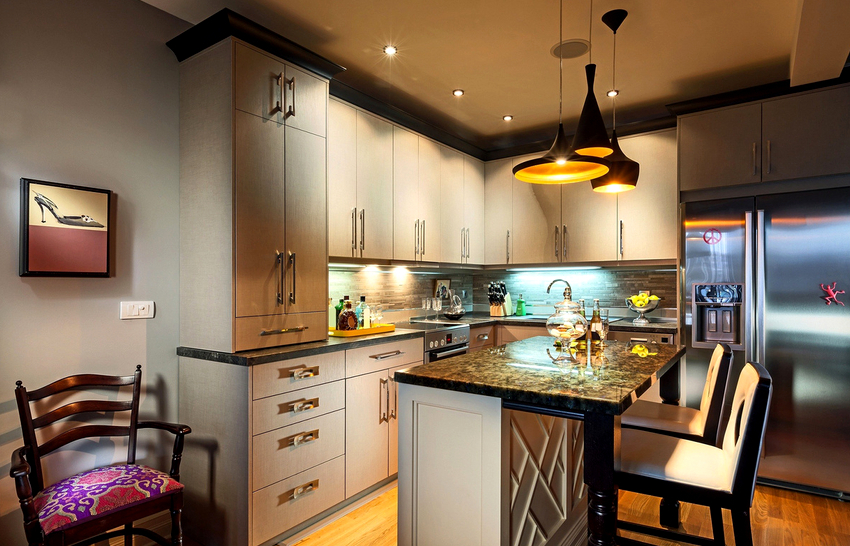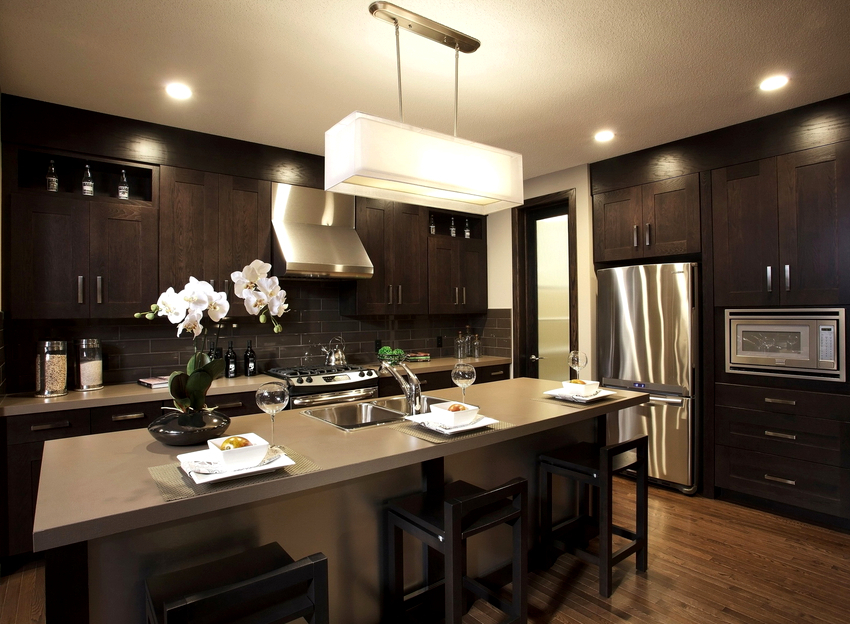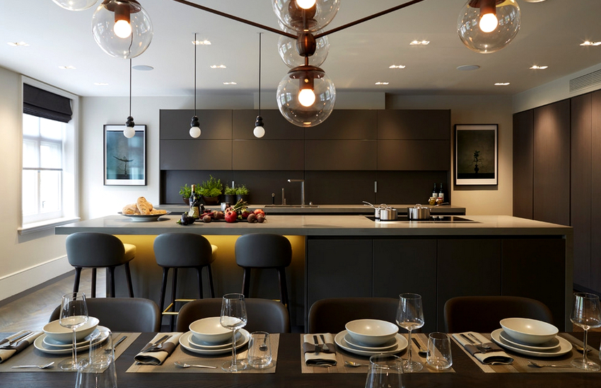 Kontrast osvjetljenja je također važan. Radno područje trebalo bi biti prilično dobro osvijetljeno. Za luster iznad stola može se koristiti slabije svjetlo. Kuhinja s tamnim završetkom treba intenzivno osvjetljenje, a za sobe u svijetlom dizajnu, nadopunjene sjajnim površinama, dovoljno je slabije osvjetljenje.