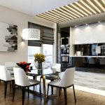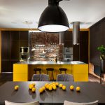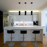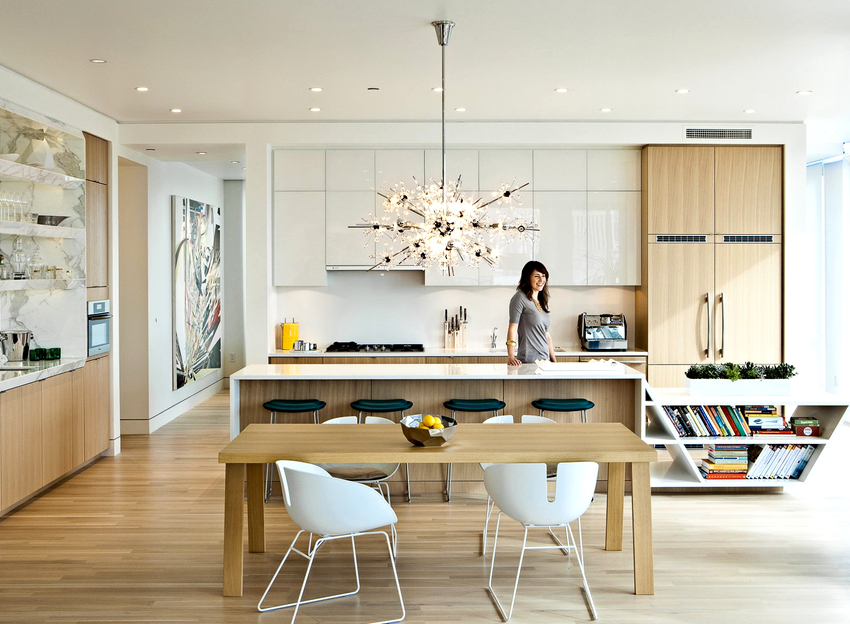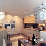 Studijska kuhinja može imati nekoliko načina osvjetljenja. Luster mora biti postavljen iznad stola za blagovanje ili u dnevnom boravku. Druga opcija uključuje osvjetljenje blagovaonice sličnim malim lusterom. Provedba takvog rješenja prikazana je na fotografiji lustera u kuhinji-dnevnoj sobi. Radno područje može biti opremljeno točkovnim izvorima svjetlosti. Kuhinjske prostore možete razgraničiti parom kompaktnih lustera koji su identični glavnom uređaju smještenom iznad šanka.