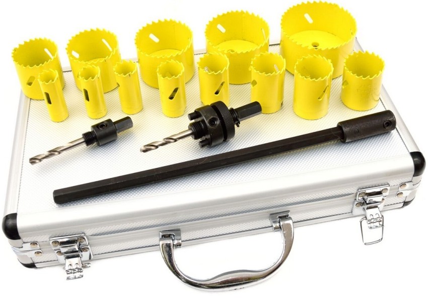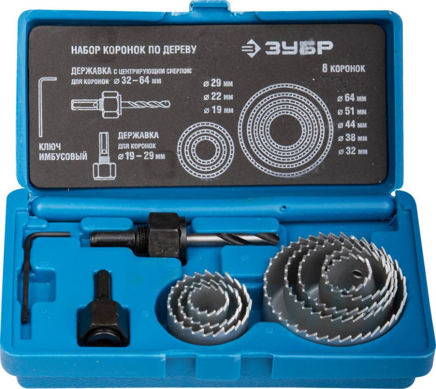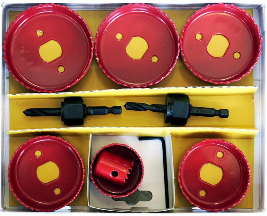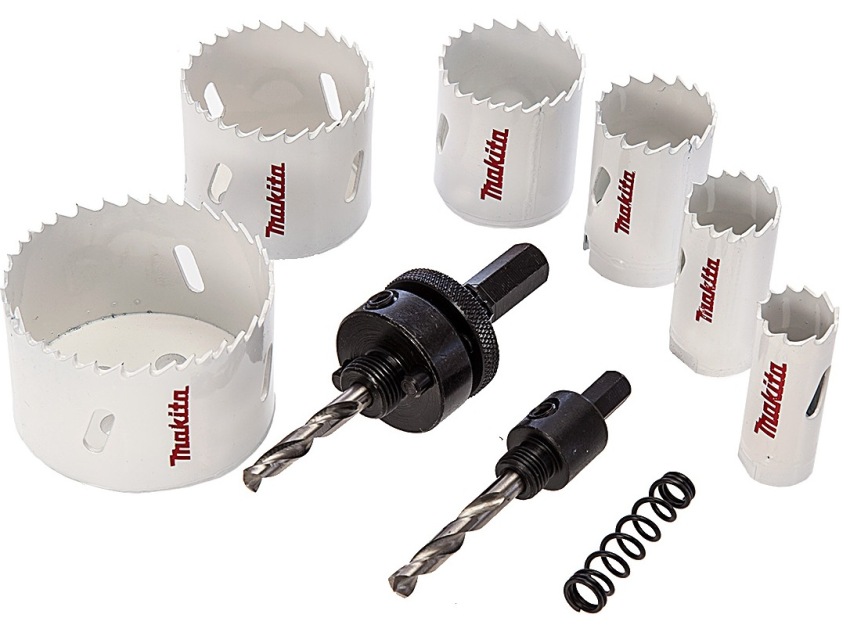 Jedinice kompleta prikladno su smještene u kompaktnom plastičnom kućištu, na čijoj se unutarnjoj strani gornjeg dijela nalazi detaljan dijagram montaže mlaznice. Standardni komplet sadrži sljedeće predmete: pile s 5 rupa, središnja bušilica, šesterokutni držač, pokrovna ploča i ključ. Setovi mogu imati različite veličine svrdla: od 64 do 102 mm, od 33 do 83 mm itd.