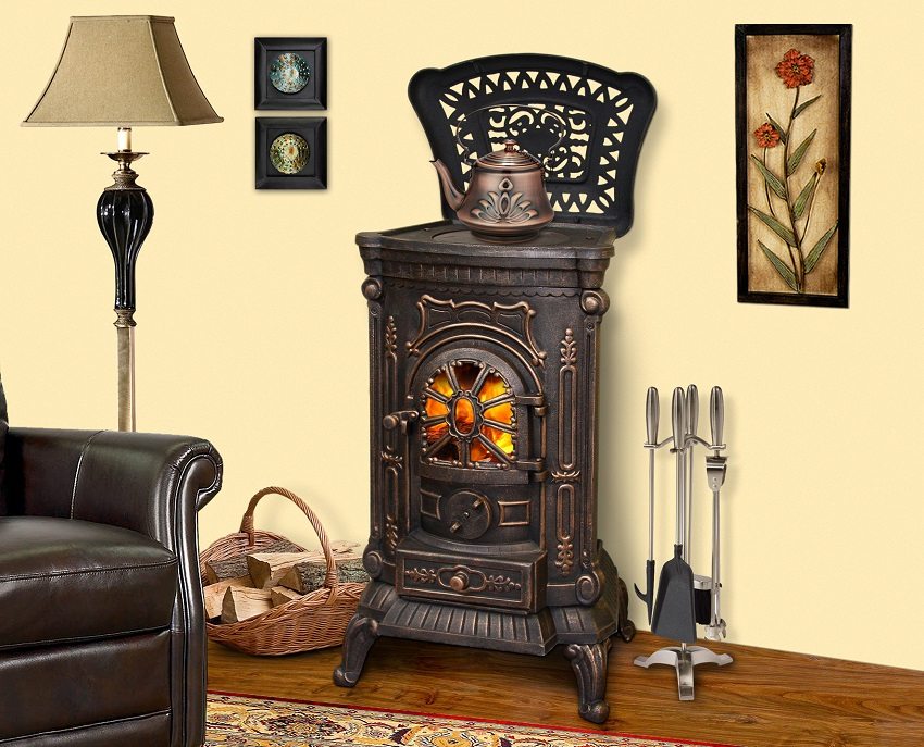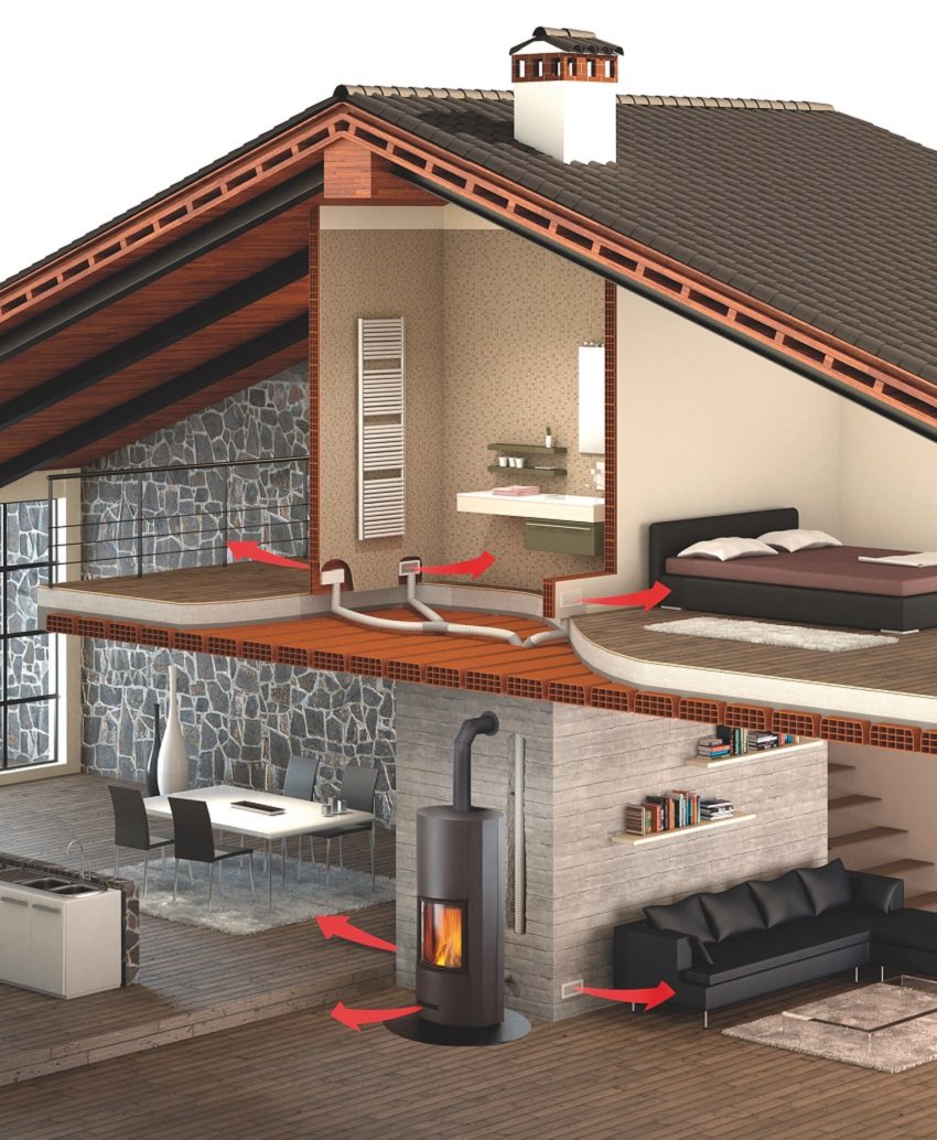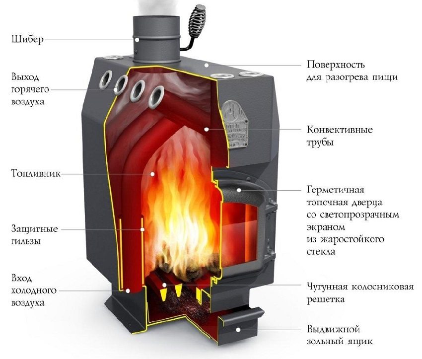- konvekcija - hladni zrak uzima se s poda, prolazi duž zagrijanih zidova komore za izgaranje i u vrućem obliku izlazi u gornji dio tijela izravno u atmosferu, zagrijavajući ga;
