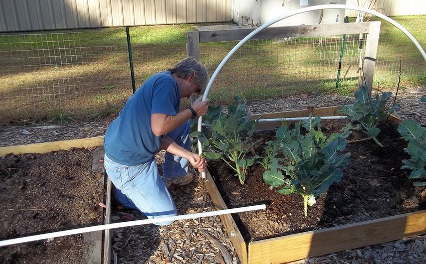 - plastične cijevi su izrezane na komade, čija veličina odgovara veličini budućeg luka, nakon čega se prolaze kroz rupe napravljene na ploči. Ostaje samo saviti cijevi u lukove i pričvrstiti njihove krajeve na kutiju. To se može učiniti pomoću običnih vijaka i stezaljki ili pomoću perforirane metalne trake. Druga je mogućnost zabiti komade armature u zemlju i na njih staviti lukove;