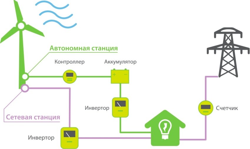 A szélgenerátor egy speciális típusú berendezés, amely a kinetikus szélenergiát mechanikussá alakítja. Meghajtja a generátorra szerelt rotorlapátokat. Ennek eredményeként a tekercsekben váltakozó áram jön létre. A keletkezett elektromos energiát akkumulátorokban tárolják, ahonnan a háztartási készülékekhez vezetik.