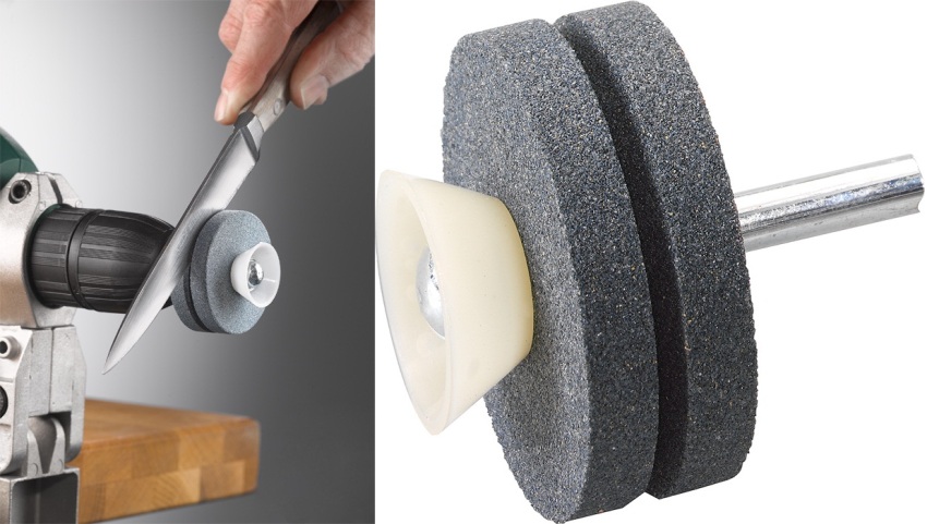 Van egy másik típusú adalékanyag is. Ez a kés és az ollók élezéséhez szükséges fúróhoz való csatlakozás, amely két csiszolókerék formájában jelenik meg, tengelyre állítva és egymástól bizonyos távolságban. Az ilyen eszköz ára körülbelül 250 rubel.