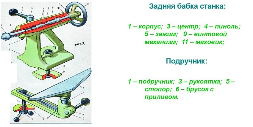 Tailstock. Ez a csomópont, amely a faipari szerkezet része, nem statikus. Nagyon fontos funkciót tölt be: feldolgozása során a kívánt pozícióba rögzíti a blankot. A munkadarab hátsó szerelvényen történő rögzítése figyelembe veszi annak a tokmányhoz való nyomását. Annak a ténynek köszönhetően, hogy a farokrész szabadon mozoghat az ágy vezetőelemei mentén, különböző hosszúságú alkatrészek rögzítése és feldolgozása biztosított.