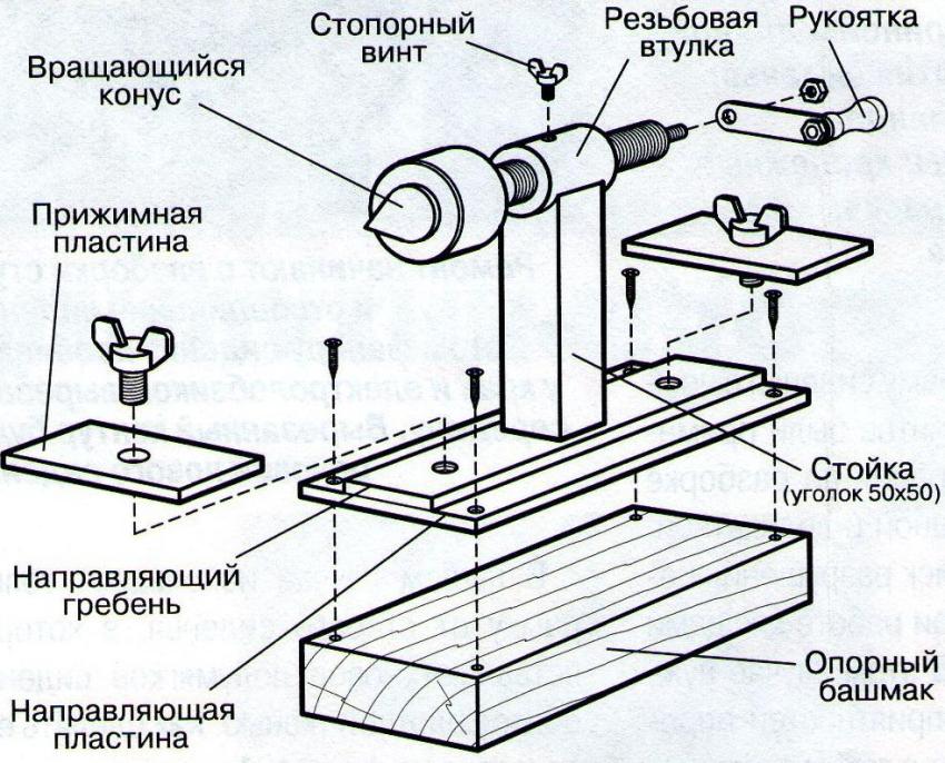 Először is ez a farokrészre vonatkozik, amely megállásként működik. Ez a szerelvény a fúróval párhuzamosan van rögzítve, és általában fatuskókból készül. A megbízhatóság érdekében ajánlott egy beállító csavart is használni, amelynek fejét egy kúp számára kiélezik.
