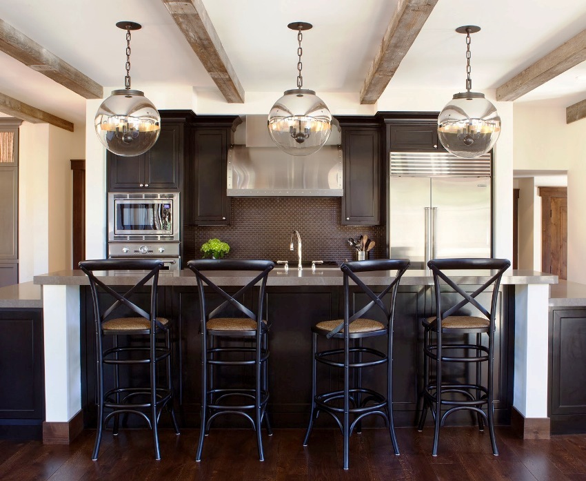 A modern stílusú konyhai tervek fotóján gyakran látható egy bárpult jelenléte, amely általában a közvetlen használat mellett a tér zónázására szolgál. A kerület körül magas bárszéket helyeznek el. A bár felett fontos elrendezni az edények fülkeivel ellátott polcokat, a poharakhoz és palackokhoz vezető útmutatásokat. Díszíthet egy modern konyhát virágdíszek, gyönyörűen elrendezett hatalmas vázák segítségével a padlón vagy az ebédlőasztalon.