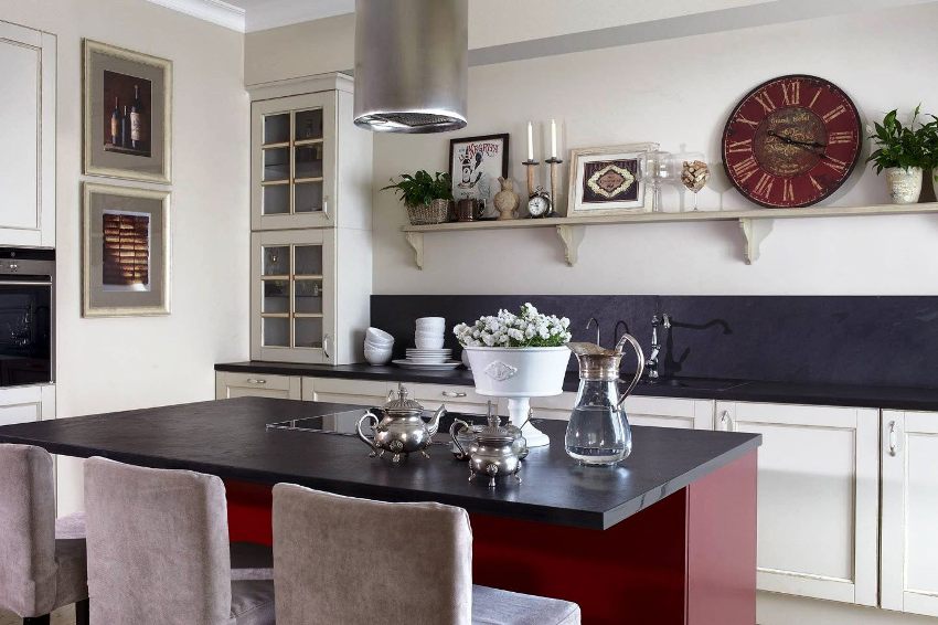 A klasszikus konyha másik jellemző vonása a motorháztető jelenléte, amelyet dekoratív homlokzat borít. A kőből készült munkalapot gyakrabban használják. A klasszikus stílusú konyhában az üveg- vagy ólomüveg ajtóknak mindig van hely a szekrényekben. Ha van egy nagymama régi tálalója, akkor ez a belső tér kiváló fénypontja lesz.