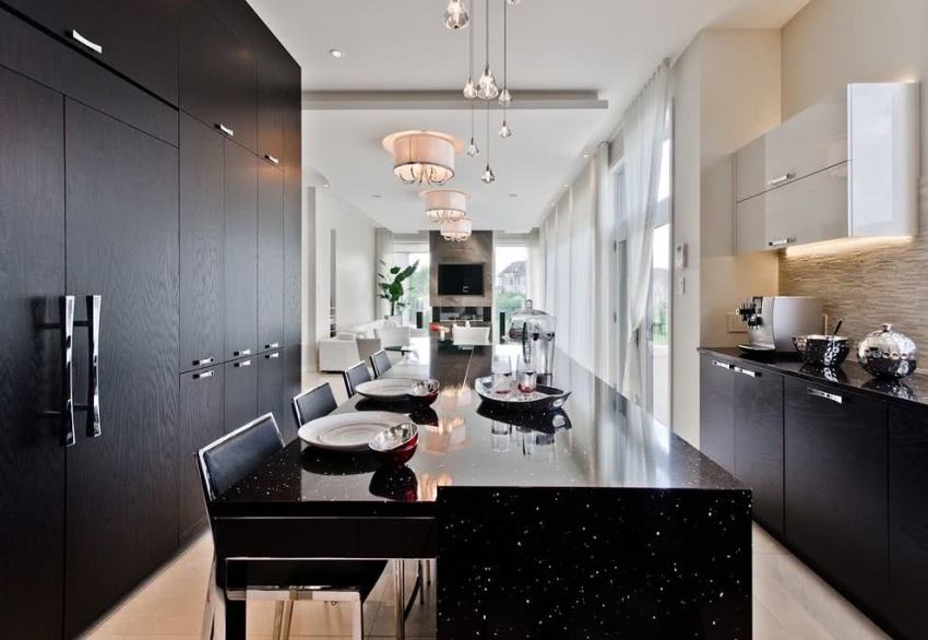Az elegáns onyx pult a luxus eleme a szobában. A pasztelllágy árnyalatú termék kényelmet, könnyedséget és szépséget kölcsönöz a szobának, és az anyag egyedülálló fényáteresztő képessége különösen vonzóvá és varázslatossá teszi a felületet. Ez a legdrágább típusú kőből készült munkalap, amelyet 18 ezer rubel / m²-től lehet megvásárolni.