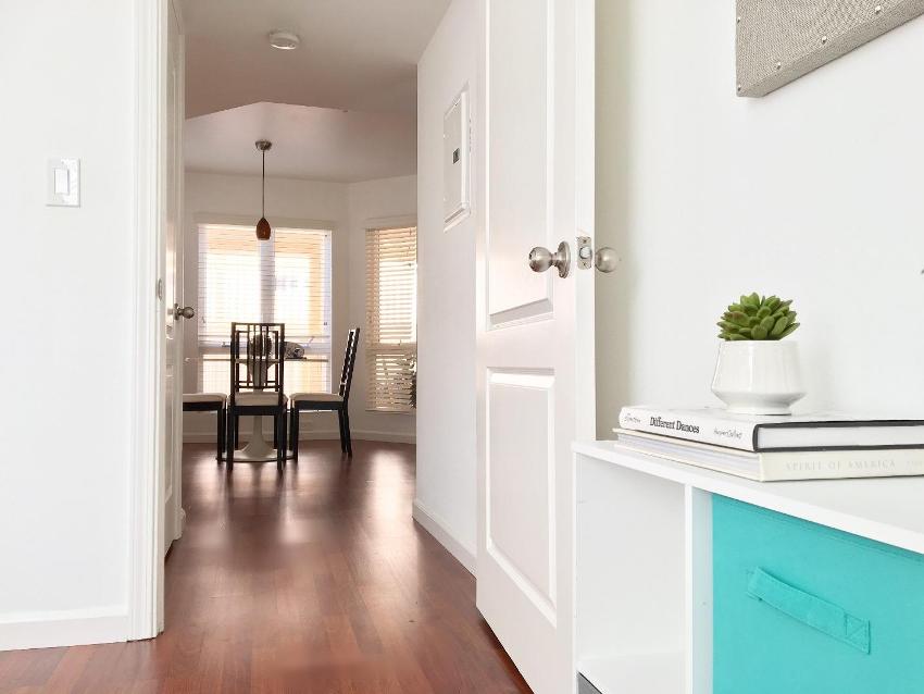 A világos ajtó, a sötét színű padló és a fehér lábazat a kulcsa az egész tér művészi képének létrehozásához. Az ajtó gazdag színe egy adott területre összpontosítja a figyelmet, ami fontos a konyha, a folyosó vagy a folyosó szempontjából. A színkontraszt a pop art vagy a minimalista belső terek létrehozásakor is kiválóan működik.