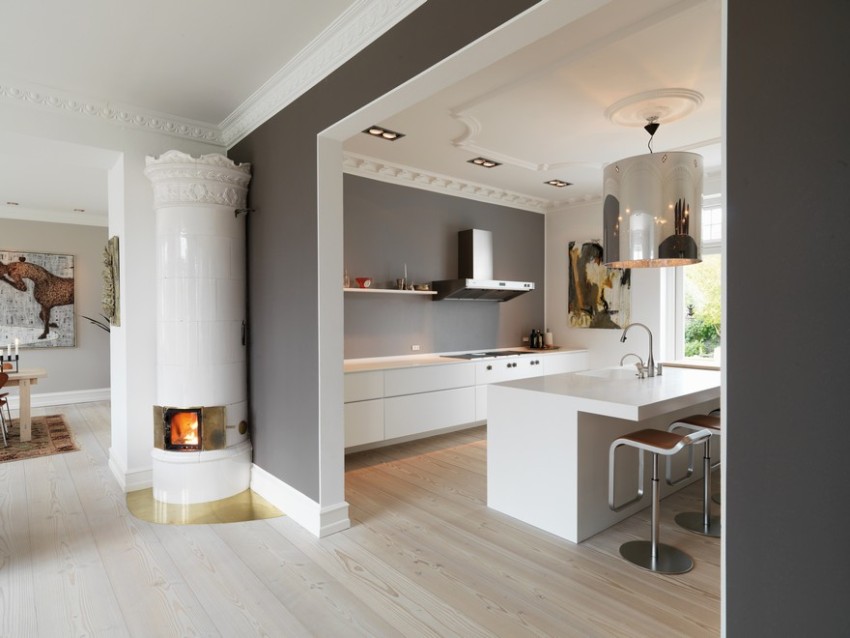 Megjegyzés: A belső térben található széles fehér szegélyléc legalább három méteres mennyezetmagasság szempontjából releváns. Ellenkező esetben ez a döntés a szabad hely éles vizuális csökkenéséhez vezet.