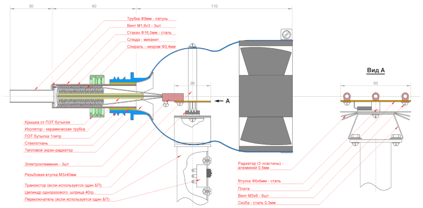 La pièce finie est placée dans un boîtier revêtu d'une couche d'isolation thermique, et ce n'est qu'alors qu'elle est connectée au câblage d'alimentation, qui comprend l'interrupteur. Un ventilateur d'air est installé à l'arrière. Il s'insère dans le boîtier ou se fixe à l'extérieur.