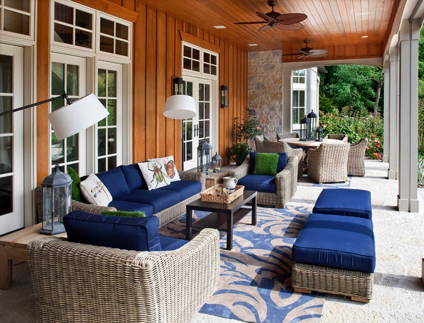 Nautico. Questo stile prevede l'uso di strutture in vimini. Per la loro fabbricazione viene utilizzato il rattan (naturale e artificiale). In questo caso, i cuscini di colore chiaro sono adatti come aggiunta ai mobili principali. Un accessorio molto apprezzato è l'ombrellone grande, che serve per proteggersi dal sole. Le foto di mobili da giardino realizzati in questo stile indicano la sua eleganza e leggerezza.