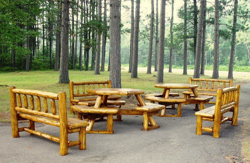 Le strutture già pronte realizzate con questo materiale sono altamente resistenti. Naturalmente, non sarà possibile realizzare una struttura portatile leggera dai tronchi, poiché queste parti sono pesanti. Oltre ai tronchi, è necessario preparare le assi da cui sono assemblati i sedili e gli schienali delle panche, nonché le superfici dei tavoli. Le immagini dei prodotti dai registri ti aiuteranno a comprendere i principi del loro assemblaggio.