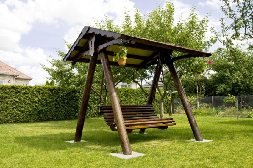 Il prossimo passo è fissare gli elementi di supporto dell'altalena nel terreno. La profondità consigliata per la loro posizione è di 70 cm La fossa dovrà essere cementata. Successivamente, viene realizzato il sedile dell'altalena. Può essere fatto secondo un piano individuale, ma ci sono alcuni standard. Le dimensioni tradizionali del sedile sono 200x50 cm. A sua volta, lo schienale ha dimensioni di 200x65 cm. L'ultima fase è appendere il sedile a una catena.
