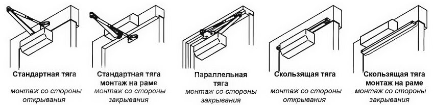 I chiudiporta sono montati sulla porta stessa o sul telaio della porta e possono essere installati internamente ed esternamente. Tutti i prodotti sono completati da uno schema di installazione e istruzioni per la regolazione del chiudiporta. Il circuito è realizzato a grandezza naturale, il che è molto comodo per un montaggio senza errori. Lo schema è fissato con nastro adesivo direttamente sulla porta, i fori sono contrassegnati su di essa.Seguendo tutte le indicazioni delle istruzioni, il corpo del dispositivo è fisso.